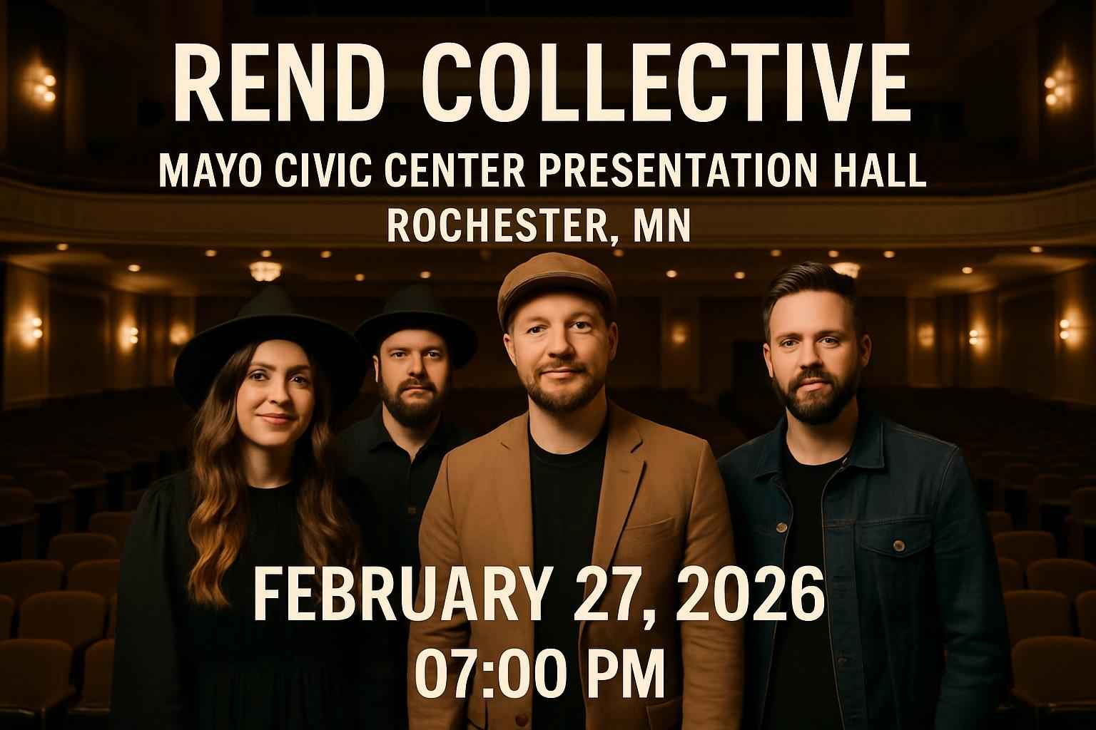 Experience Rend Collective live at Mayo Civic Center Presentation Hall in Rochester, MN on February 27, 2026, at 7 PM. Secure tickets with exclusive discounts via RSVP Event Agency, offering verified promo codes and real-time availability. Enjoy easy parking, nearby hotels, and dining options for a seamless, family-friendly Christian music concert experience in downtown Rochester.