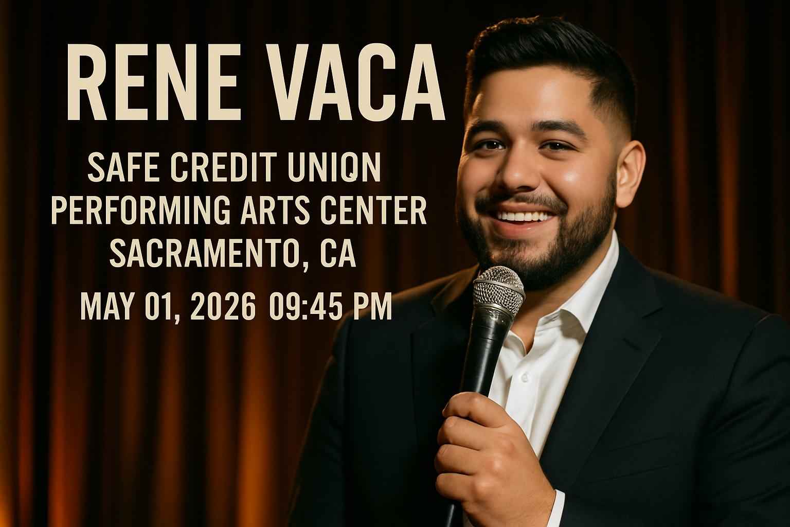 Experience an unforgettable night of comedy as Rene Vaca performs live at the SAFE Credit Union Performing Arts Center in Sacramento CA on May 01 2026 at 9:45 PM. This highly anticipated event draws fans from across Sacramento County and Northern California seeking exclusive Rene Vaca ticket deals and top-rated discount codes. Secure your seat at this comedy show through RSVP Event Agency to access verified Rene Vaca promo codes and special event coupons unique to our site.