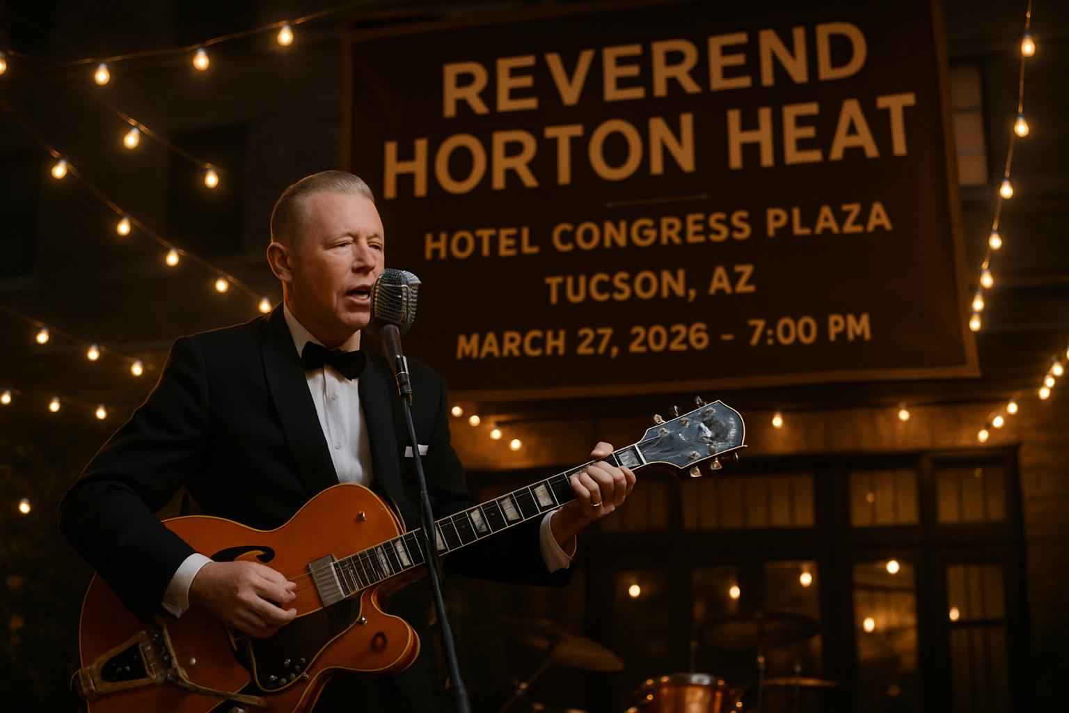 Experience the legendary Reverend Horton Heat live at Hotel Congress Plaza in Tucson AZ on March 27 2026 at 7:00 PM. Secure premium tickets and exclusive coupon codes from RSVP Event Agency to enjoy unbeatable savings on your next night out in downtown Tucson. Discover everything you want to know about this high-energy rockabilly concert and maximize your ticket value now.