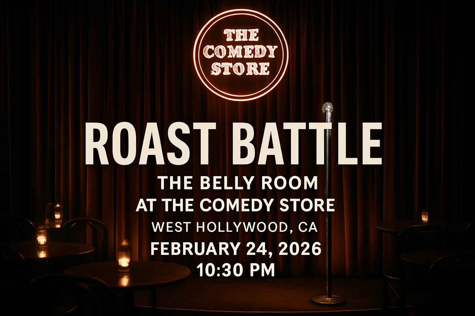 Experience Roast Battle – The Belly Room at The Comedy Store in West Hollywood CA on February 24 2026 at 10:30 PM. This iconic late-night comedy showdown features top LA comics exchanging hilarious roast jokes in a legendary venue known for launching careers. Secure your seat at the heart of Los Angeles stand-up scene and enjoy a night filled with sharp wit and unforgettable moments. RSVP Event Agency provides exclusive promo codes and discount tickets for this event making it easier than ever to enjoy top-tier comedy at a reduced price.