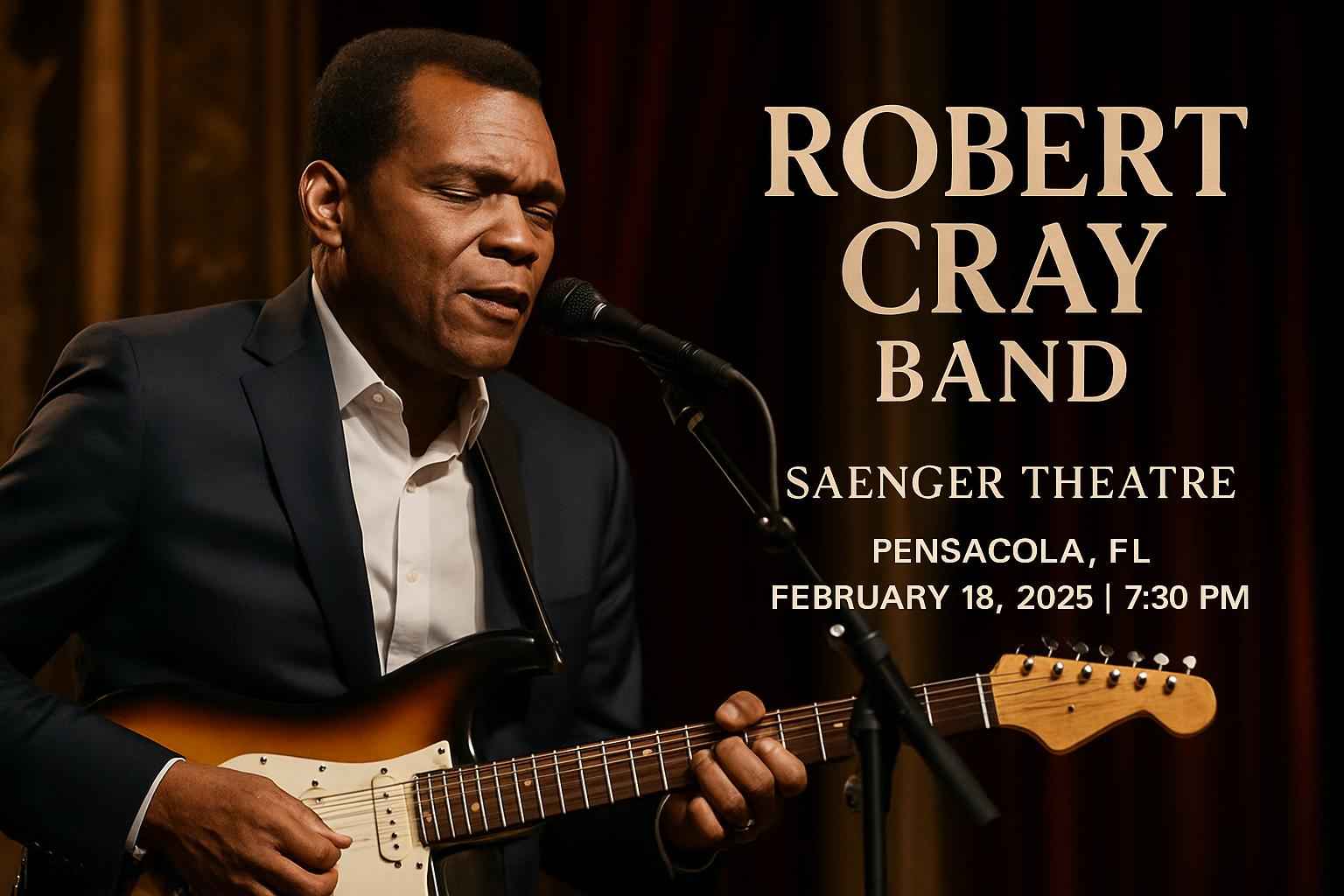 Experience the iconic Robert Cray Band live at Saenger Theatre – FL in Pensacola on February 18, 2026 at 07:30 PM. Join fellow blues fans for an unforgettable night filled with soulful guitar performances and timeless hits. RSVP Event Agency provides exclusive Robert Cray Band promo codes and special ticket discounts, making it easier to secure your spot at this highly anticipated concert.