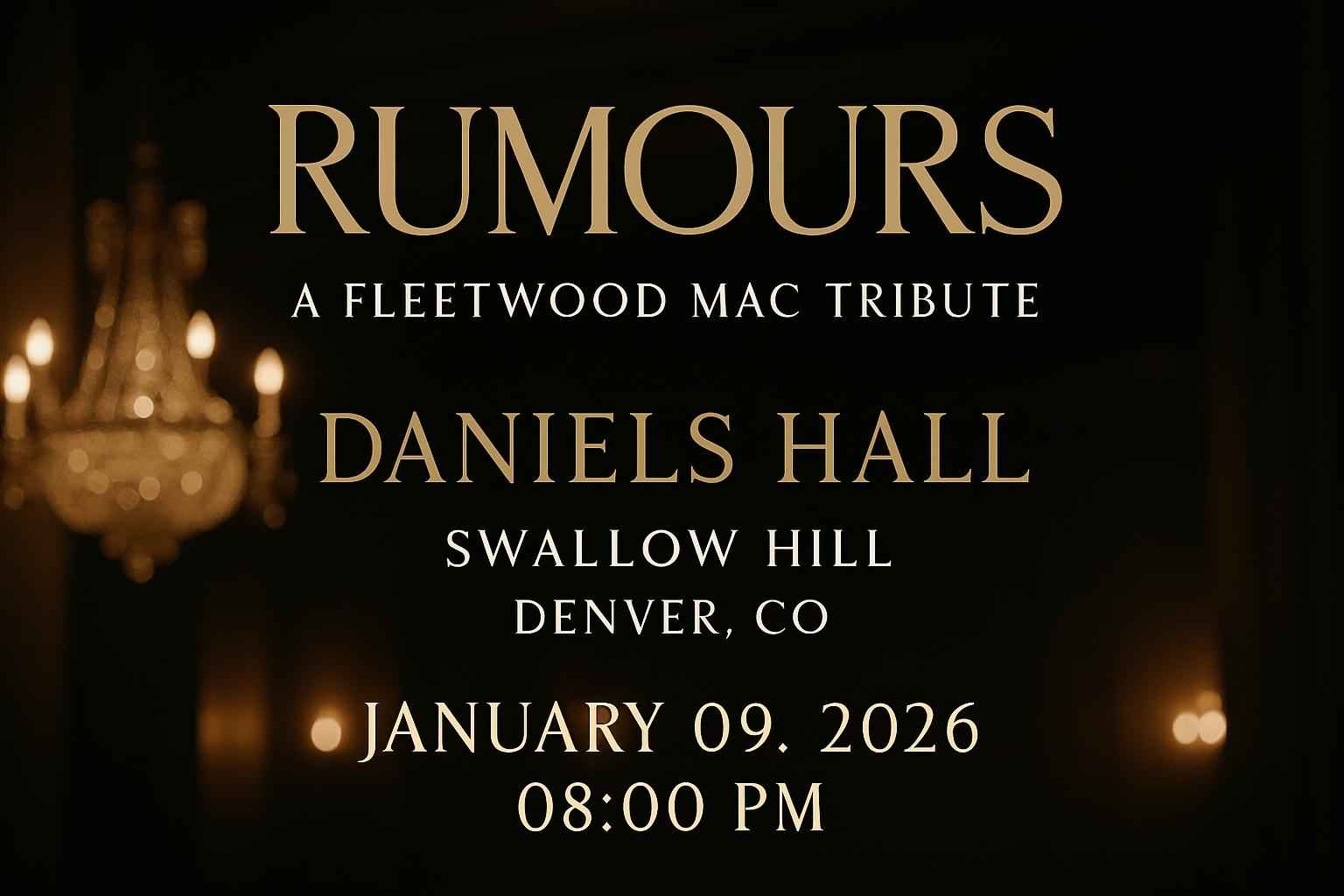 Experience the unforgettable sounds of Rumours – A Fleetwood Mac Tribute at Daniels Hall – Swallow Hill in Denver CO on January 09 2026 at 8:00 PM. Discover the best coupon codes for Rumours – A Fleetwood Mac Tribute and secure exclusive savings with RSVP Event Agency. This highly anticipated tribute brings Fleetwood Mac’s classic hits to life with authentic energy drawing fans from across Colorado and beyond.