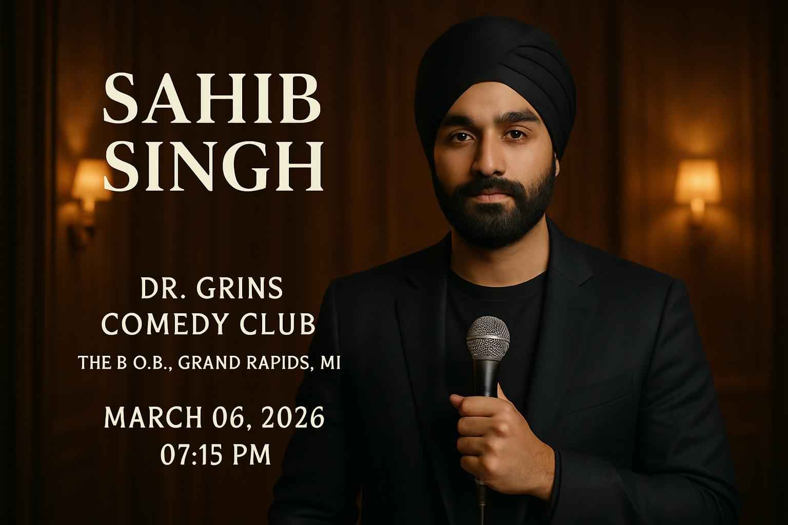 Sahib Singh brings a fresh stand-up set to Dr Grins Comedy Club at The BOB located in downtown Grand Rapids MI at 20 Monroe Ave NW. The show starts at 0715 PM on March 06 2026. The BOB is known for its vibrant comedy scene and top-rated local entertainment making it one of the best places to see live comedy in Michigan.