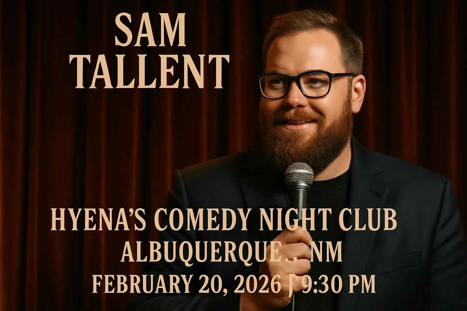 Sam Tallent takes the stage at 930 PM on February 20 2026 at Hyenas Comedy Night Club in Albuquerque NM.