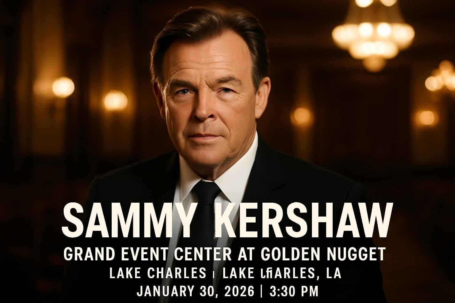 Experience Sammy Kershaw live at the Grand Event Center, Golden Nugget Lake Charles, on January 30, 2026, at 8:30 PM. Enjoy classic country hits in a top venue with premium seating options. Save on tickets using exclusive RSVP Event Agency promo codes. Nearby hotels and ample parking ensure a convenient, memorable concert night in Lake Charles, LA.