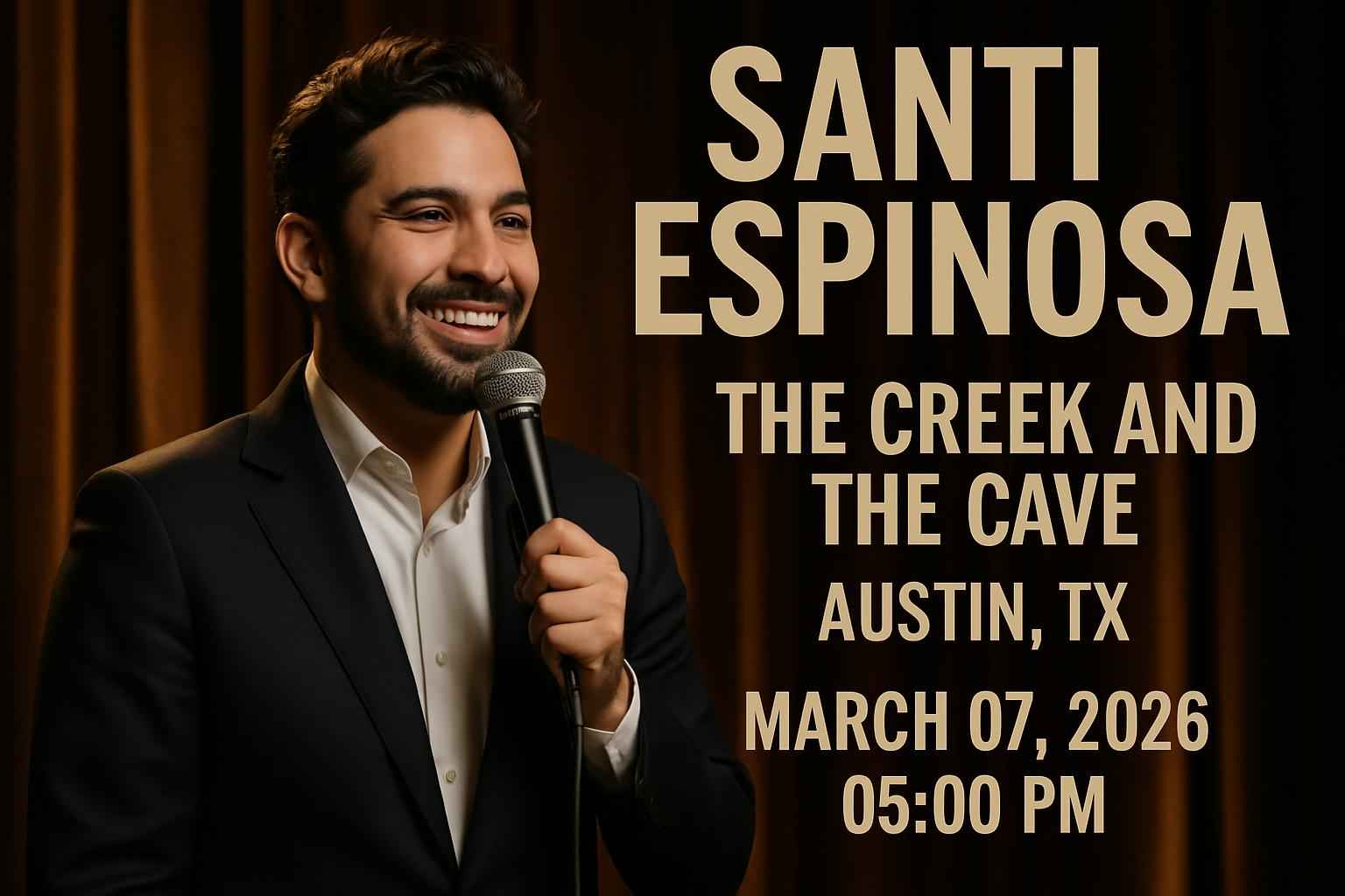 Santi Espinosa brings an energetic and engaging comedy experience to The Creek and The Cave Austin TX on March 7 2026. This popular Austin comedy venue is known for its intimate atmosphere and top-tier acts making it the perfect spot to catch Santi Espinosa. Doors open at 5 PM so arrive early for the best seats and a full night of laughter.
