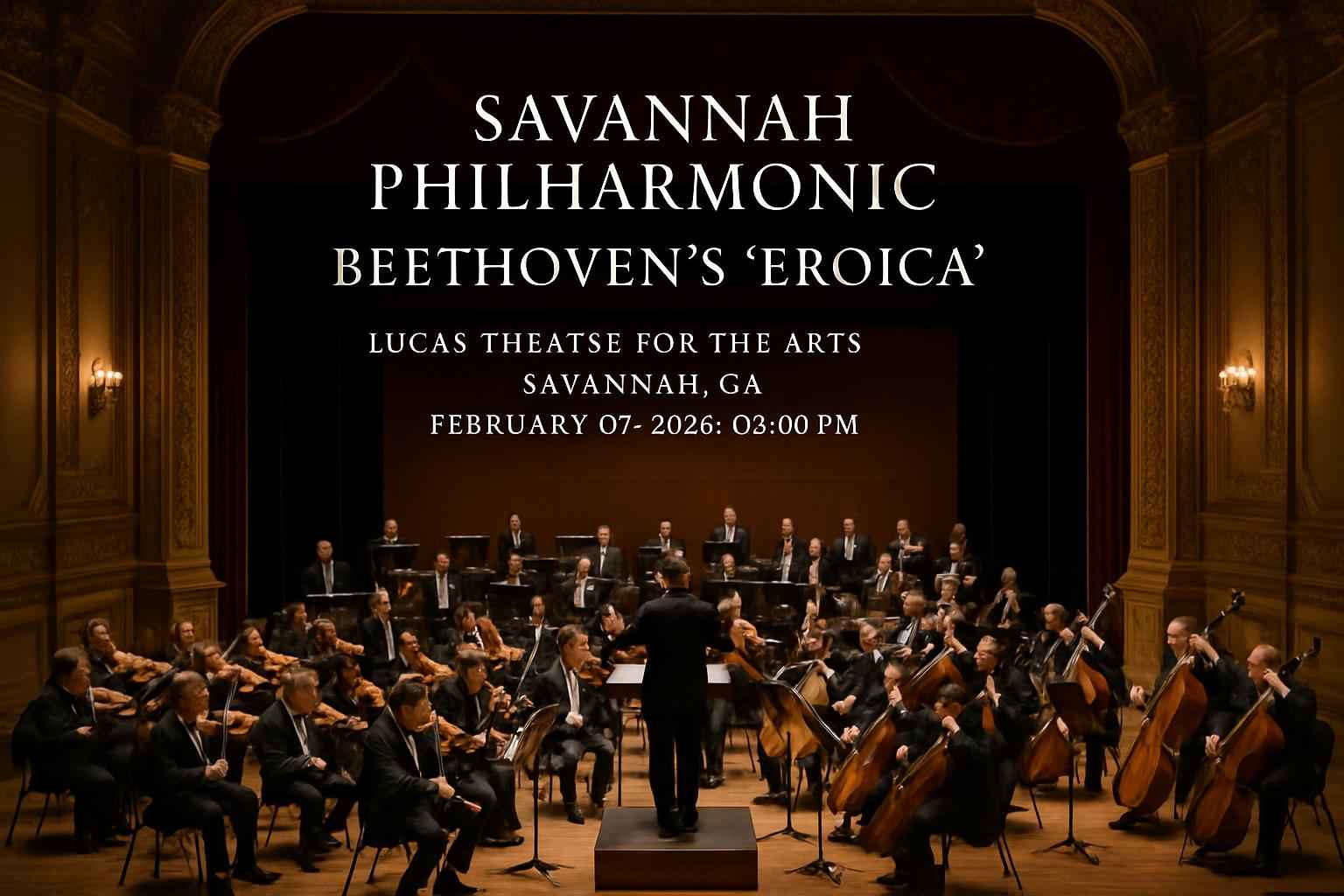Experience Savannah Philharmonic: Beethoven’s Eroica at Lucas Theatre for the Arts in Savannah GA on February 7 2026 at 3 PM. This highly anticipated concert features Beethoven’s Symphony No 3 Eroica performed by the acclaimed Savannah Philharmonic in the heart of downtown Savannah. Secure your seat at this exclusive classical music event and enjoy the rich acoustics of Lucas Theatre while saving with verified promo codes from RSVP Event Agency.