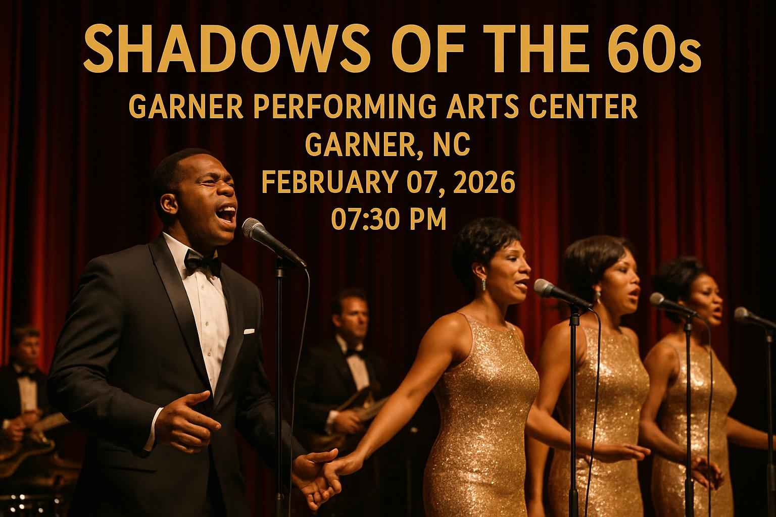 Experience the iconic Motown sound live at Shadows of The 60s on February 7, 2026, 7:30 PM, at Garner Performing Arts Center, NC. Enjoy hits from The Supremes, The Four Tops, and The Temptations. Secure tickets with exclusive RSVP Event Agency promo codes for up to 15% off. Don’t miss this nostalgic, high-energy tribute concert in Wake County.