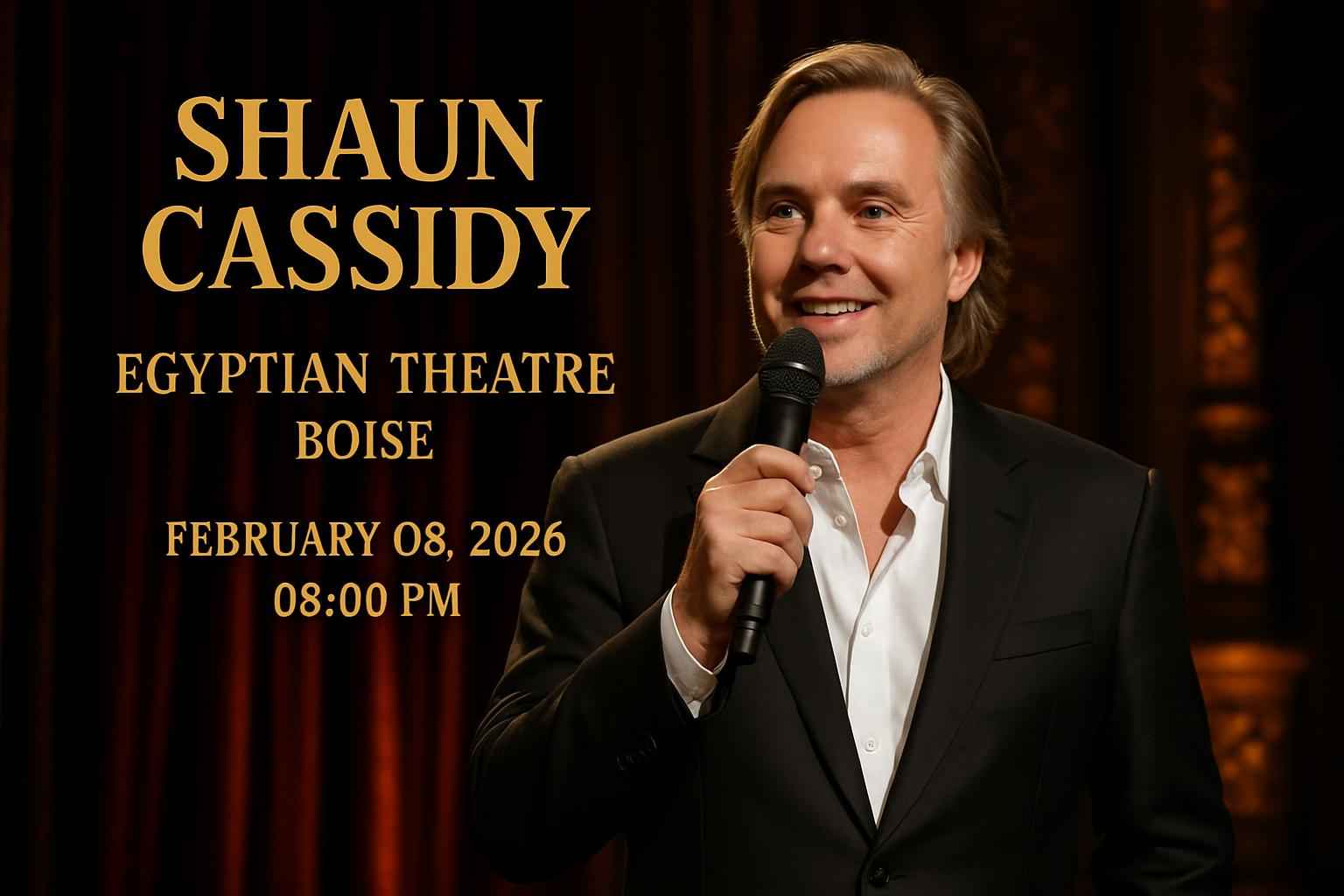 Shaun Cassidy returns to Boise with a live show at the Egyptian Theatre located in downtown Boise ID. The event is scheduled for Sunday February 8 2026 at 8:00 PM. Attendees can expect an evening filled with classic hits and a vibrant atmosphere in one of Boise’s most iconic venues. The Egyptian Theatre is known for its excellent acoustics and historic charm making it a top choice for live concerts in Boise.