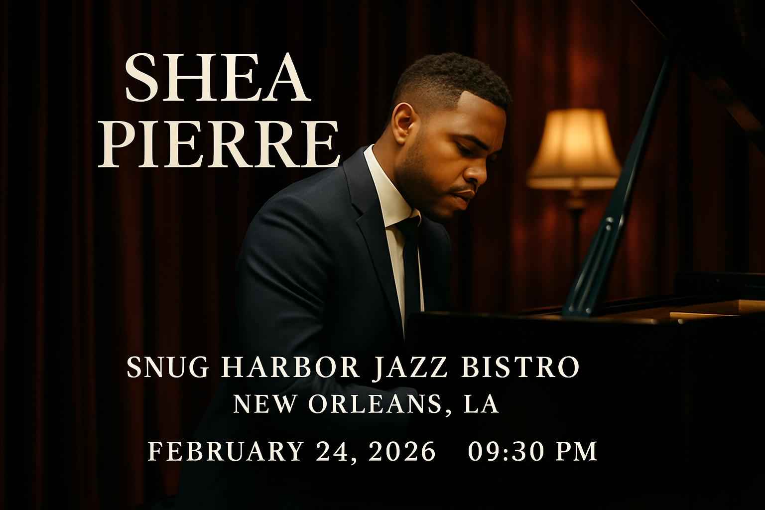 Shea Pierre performs at 930 PM on February 24 2026 at Snug Harbor Jazz Bistro in New Orleans LA.
