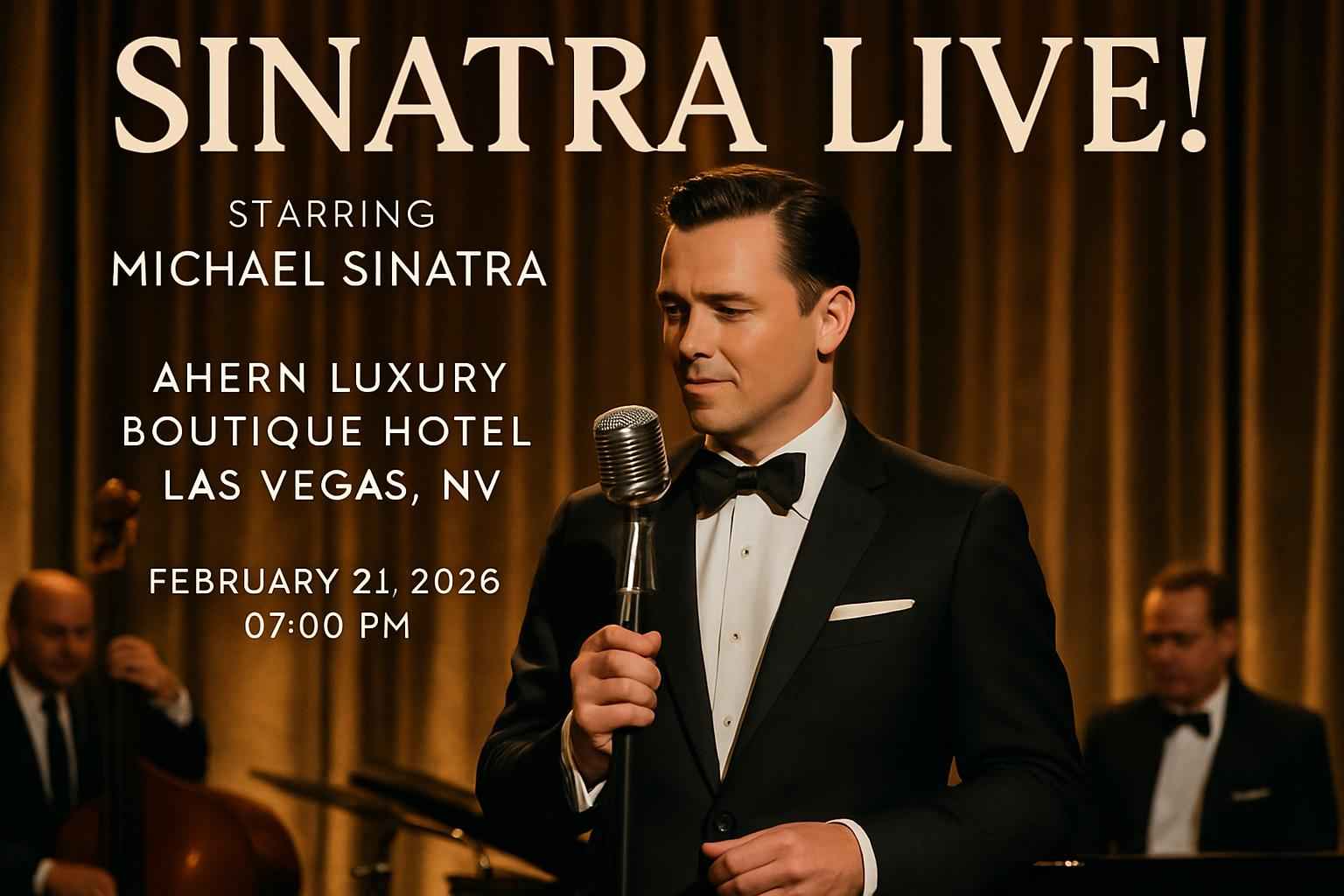 Experience Sinatra Live Starring Michael Sinatra on February 21, 2026, at Ahern Luxury Boutique Hotel, Las Vegas. Enjoy classic Sinatra hits in an intimate luxury setting with premium seating, complimentary parking, and signature cocktails. Use RSVP Event Agency promo codes for ticket discounts. Doors open at 6 PM, show starts at 7 PM. Dress business casual to cocktail attire.