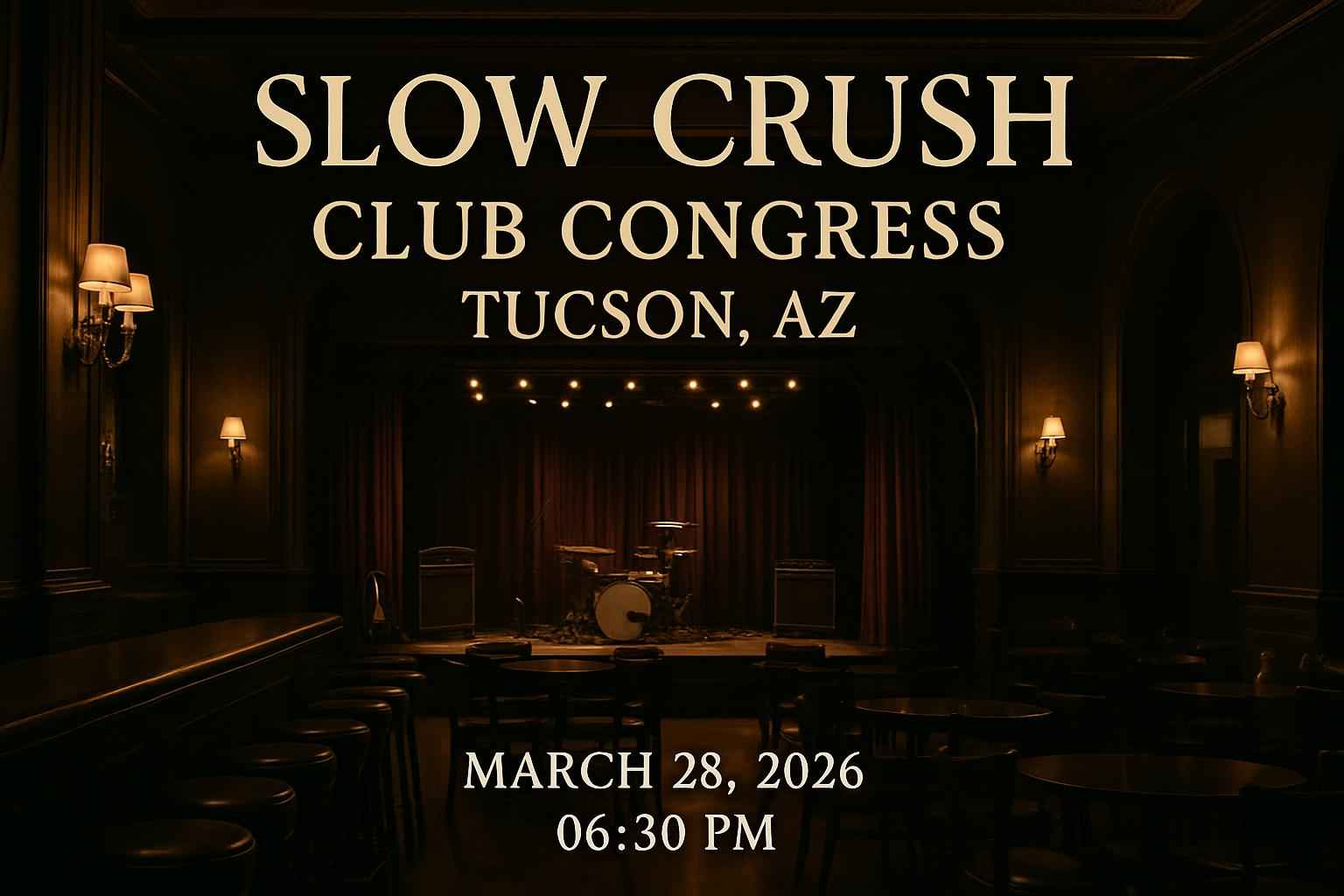 Located in the heart of downtown Tucson Club Congress is a premier live music venue known for its vibrant atmosphere and top-tier sound. Doors open at 0530 PM with Slow Crush taking the stage at 0630 PM on March 28 2026. Early arrival is recommended for the best general admission spots and to enjoy local food and drink options near the venue. Secure your discounted tickets with a Slow Crush Club Congress promo code and experience this unforgettable live event.