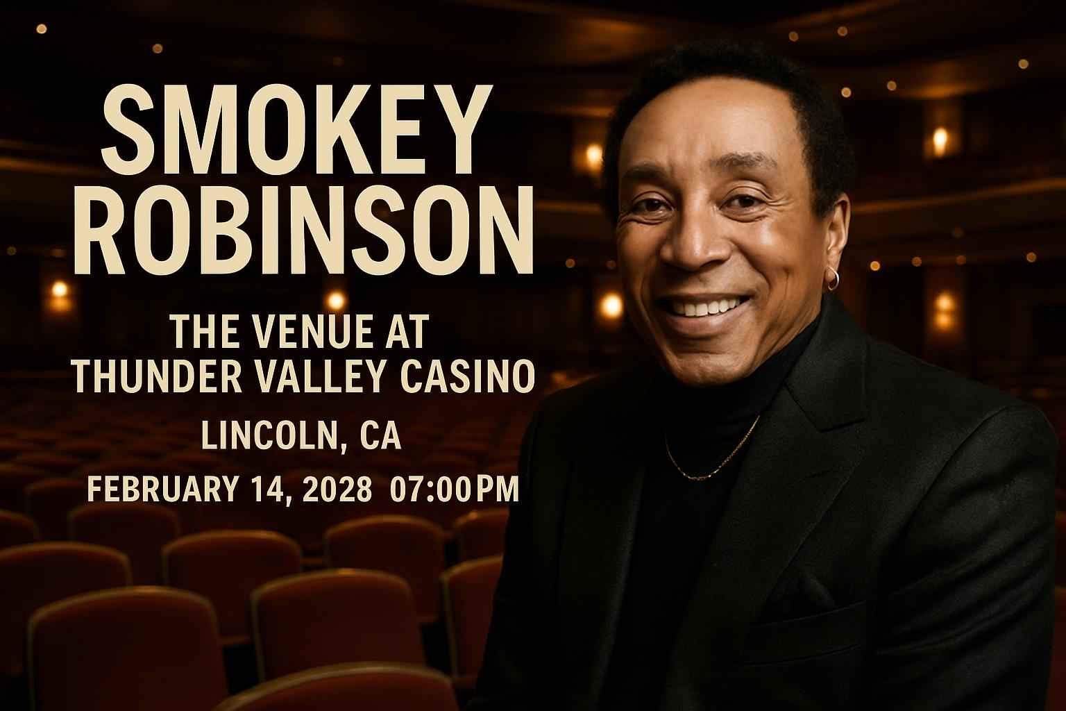 Experience Smokey Robinson live at The Venue at Thunder Valley Casino, Lincoln, CA, on February 14, 2026, at 7 PM. Enjoy Motown classics in a premium setting with onsite parking and nearby dining. Secure tickets with exclusive coupon codes and discounts from RSVP Event Agency. Book early for the best seats and save on this unforgettable Valentine’s concert.