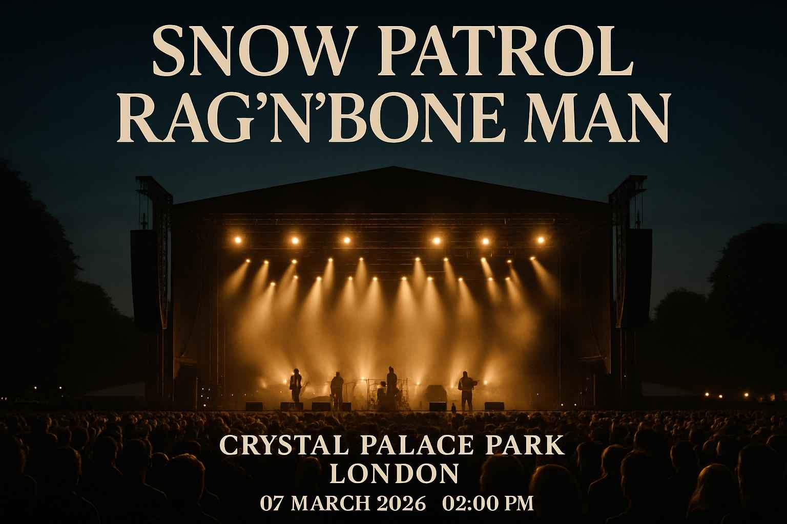Crystal Palace Park in London LND will host this major live event, drawing fans from across the UK. Doors open at 2:00 PM on March 7, 2026. The venue offers easy access via public transport and nearby parking. Expect iconic hits from Snow Patrol plus soulful performances from Rag N Bone Man. This concert promises a lively atmosphere and premium sound production.