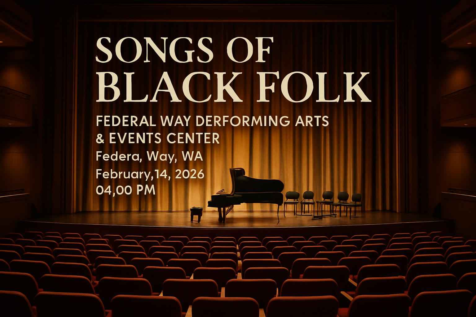 Experience Songs Of Black Folk on February 14, 2026, at Federal Way Performing Arts & Events Center, celebrating Black musical heritage with live gospel, jazz, blues, and spoken word. Book early via RSVP Event Agency to access exclusive coupon codes, group discounts, and secure the best seats. Convenient location and amenities make it ideal for Seattle-Tacoma area attendees.