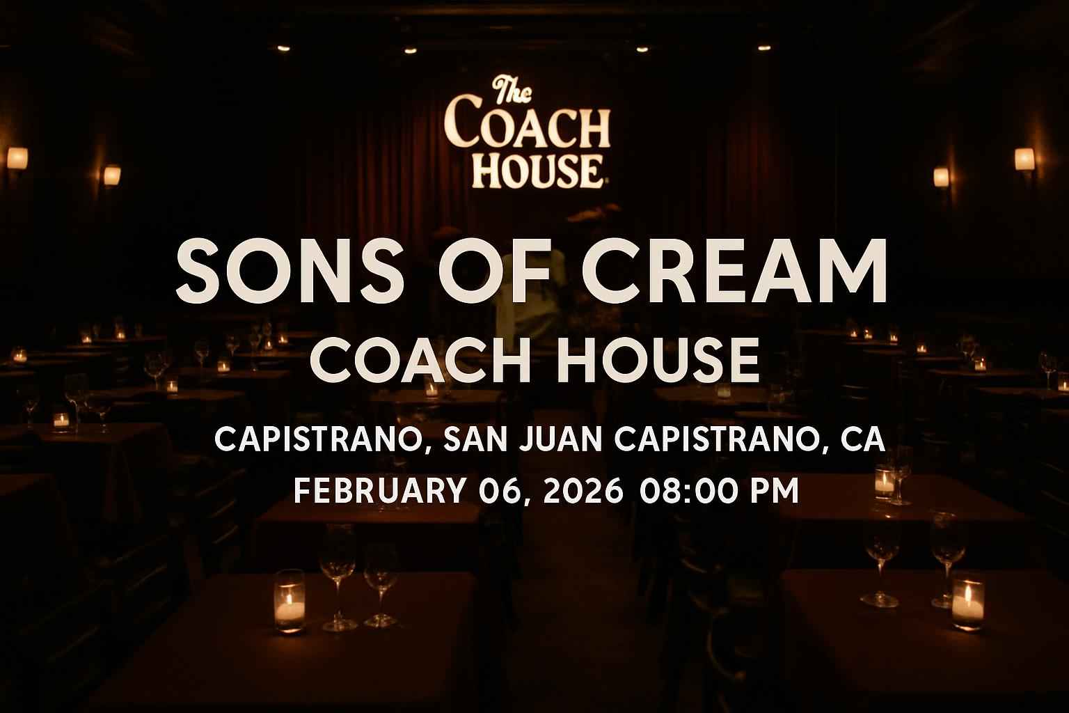 Unlock verified Sons of Cream Coach House Capistrano coupon codes for exclusive ticket discounts. RSVP Event Agency offers top promo codes and special savings for the February 6 2026 show. Save instantly when you book your tickets now and guarantee your spot at this high-demand event.