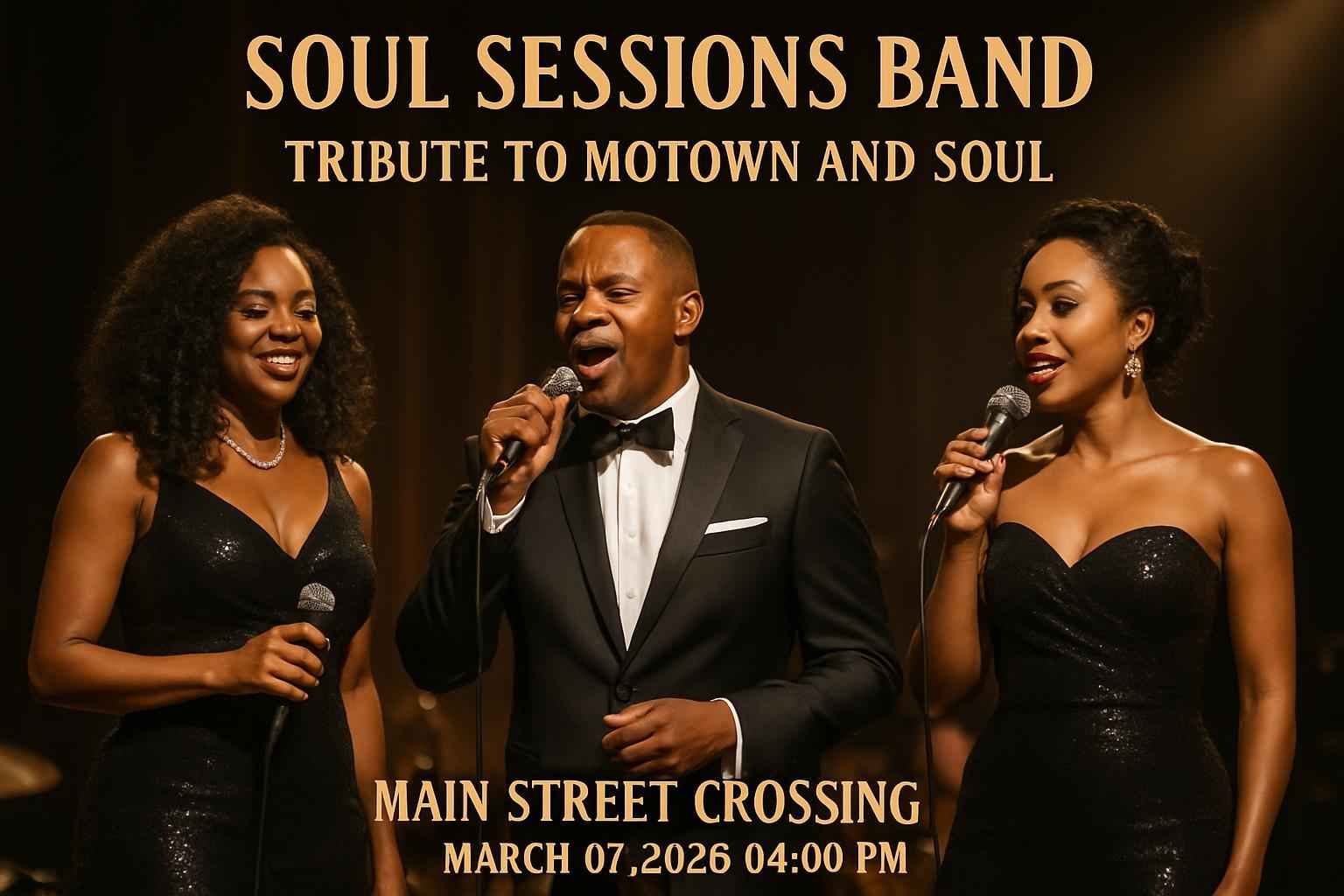 The Soul Sessions Band – Tribute to Motown and Soul begins at 4:00 PM on March 07 2026 at Main Street Crossing in Tomball TX.