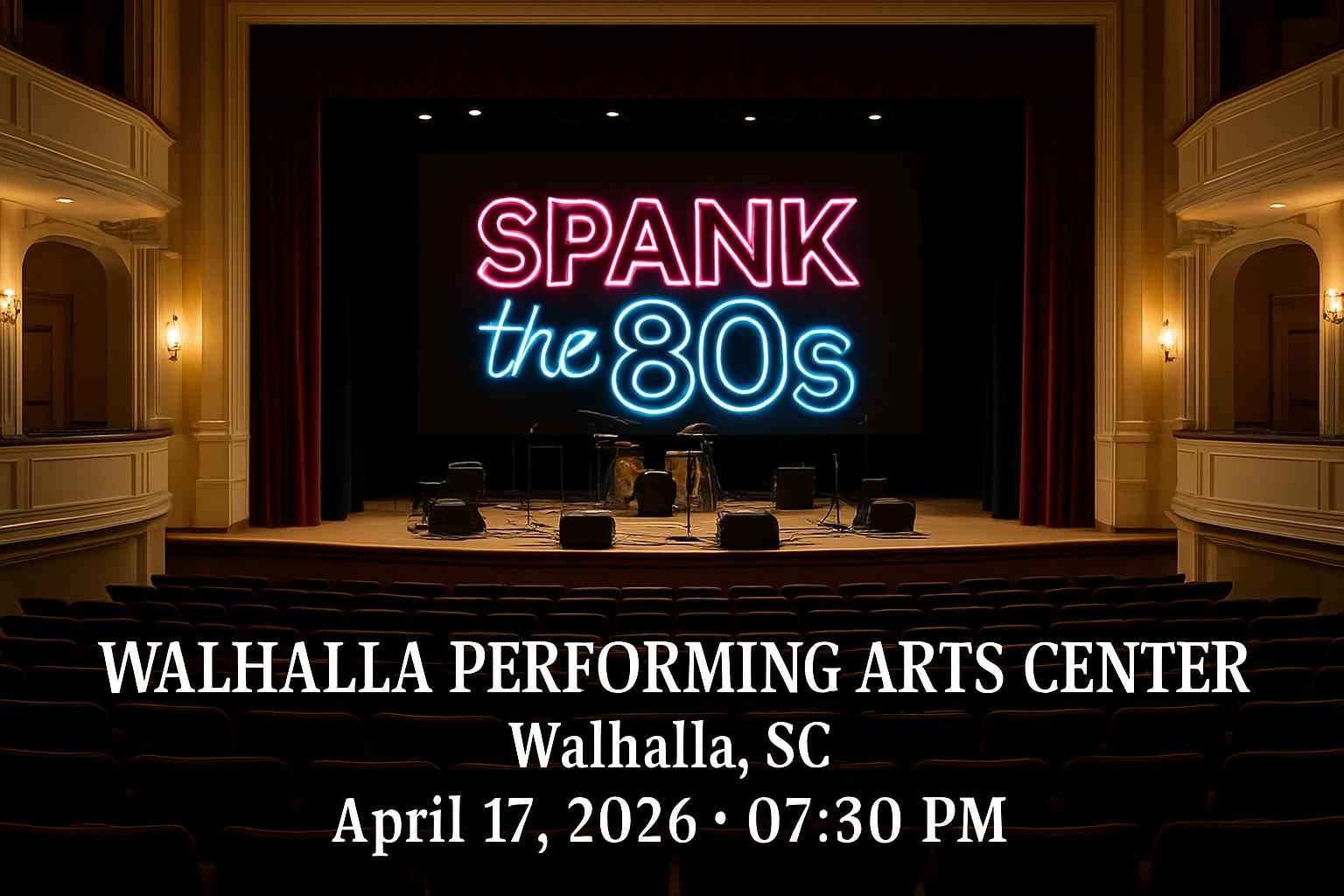 SPANKthe80s takes place at the renowned Walhalla Performing Arts Center located at 101 E North Broad St Walhalla SC. Doors open at 630 PM with showtime at 730 PM. Choose from premium seating and standard options to match your group’s preferences. RSVP Event Agency offers the lowest prices on authentic tickets plus additional discounts for groups and early reservations. Enjoy fast entry and customer support for a seamless event experience in Oconee County.