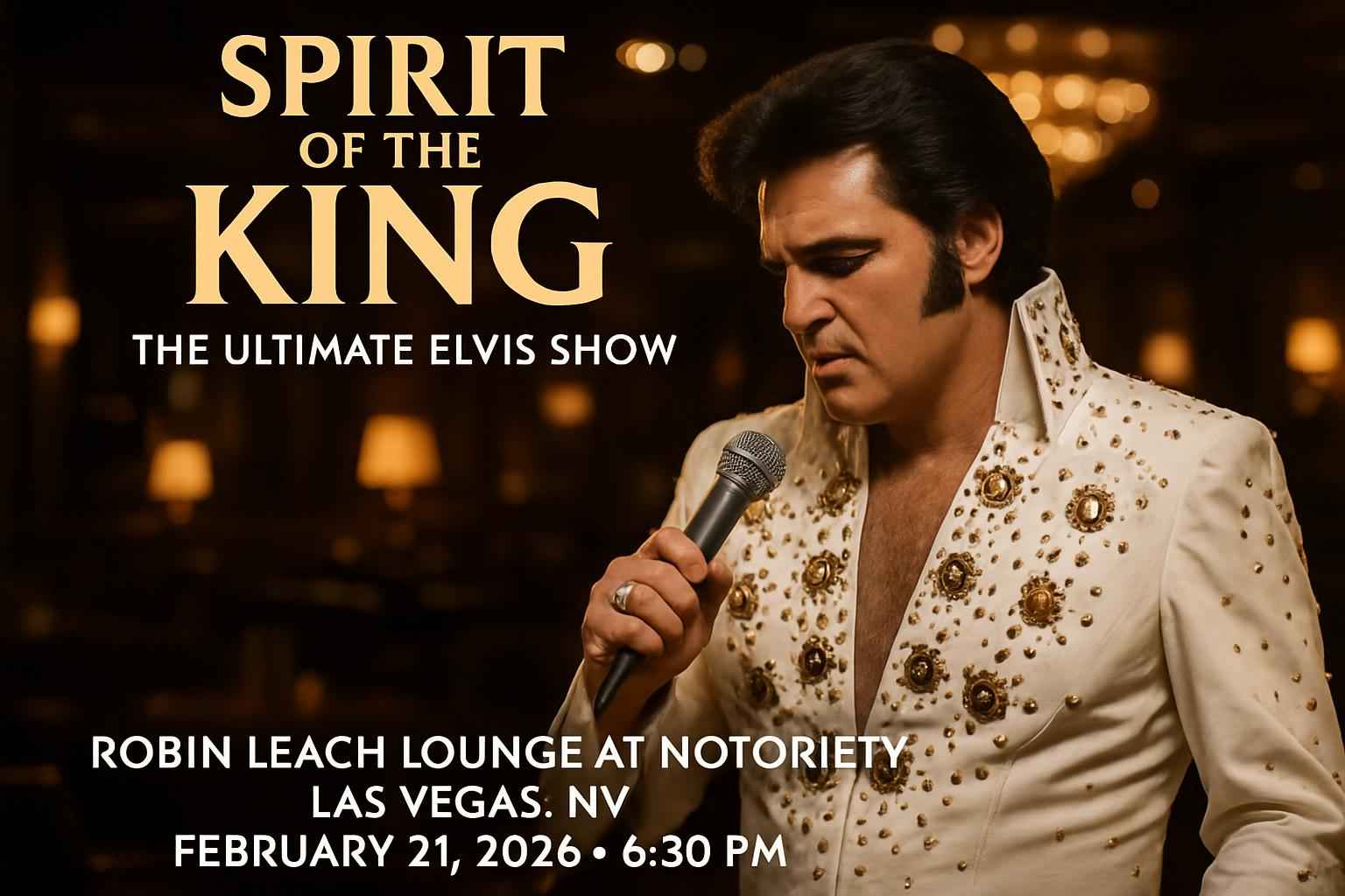 Experience Las Vegas entertainment history with Spirit of the King The Ultimate Elvis Show at Robin Leach Lounge at Notoriety Las Vegas NV on February 21 2026 at 0630 PM. This event brings the timeless energy of Elvis Presley to the heart of downtown Las Vegas with world-class tribute performances. Secure your spot for an unforgettable tribute night in a premier venue famous for intimate live music and top-tier sound.