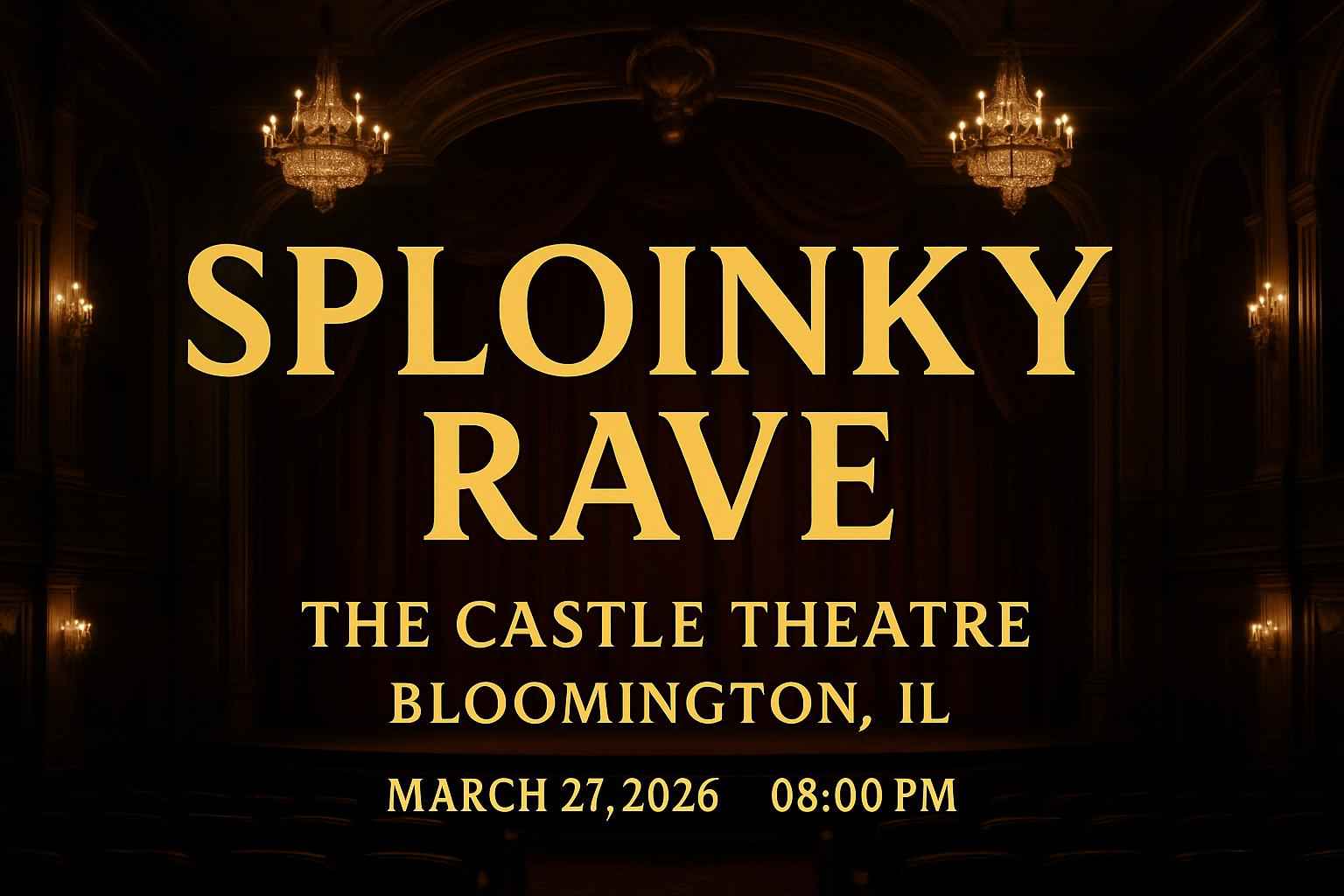 Experience the electrifying Sploinky Rave at The Castle Theatre in Bloomington IL on March 27 2026 at 8 PM. This high-energy EDM event draws rave fans from across Illinois with immersive sound spectacular lighting and groundbreaking performances. Secure your entry with exclusive Sploinky Rave coupon codes and promo discounts from RSVP Event Agency. Find trusted ticket info event details and savings for this must-attend Bloomington rave.