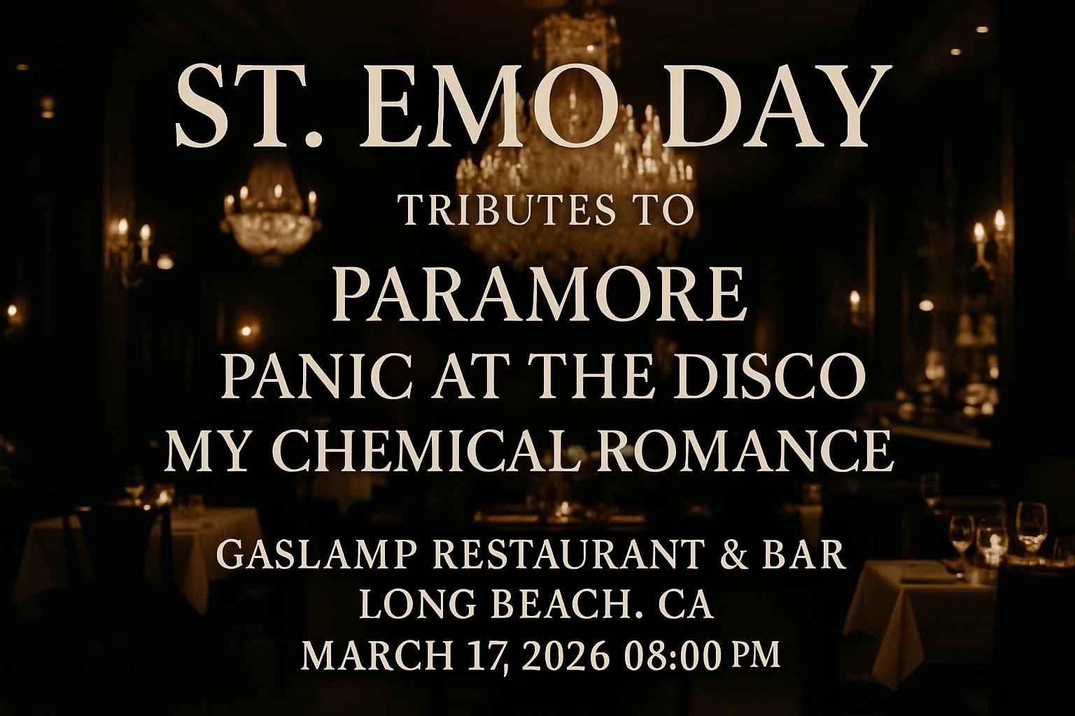 Experience the energy of St Emo Day Tributes to Paramore Panic At The Disco and My Chemical Romance at Gaslamp Restaurant and Bar in Long Beach CA on March 17 2026 at 8 PM. This highly anticipated event brings together top tribute bands performing iconic hits from the biggest names in emo rock. Secure your spot at the heart of Long Beachs live music scene with exclusive savings and event info powered by RSVP Event Agency.