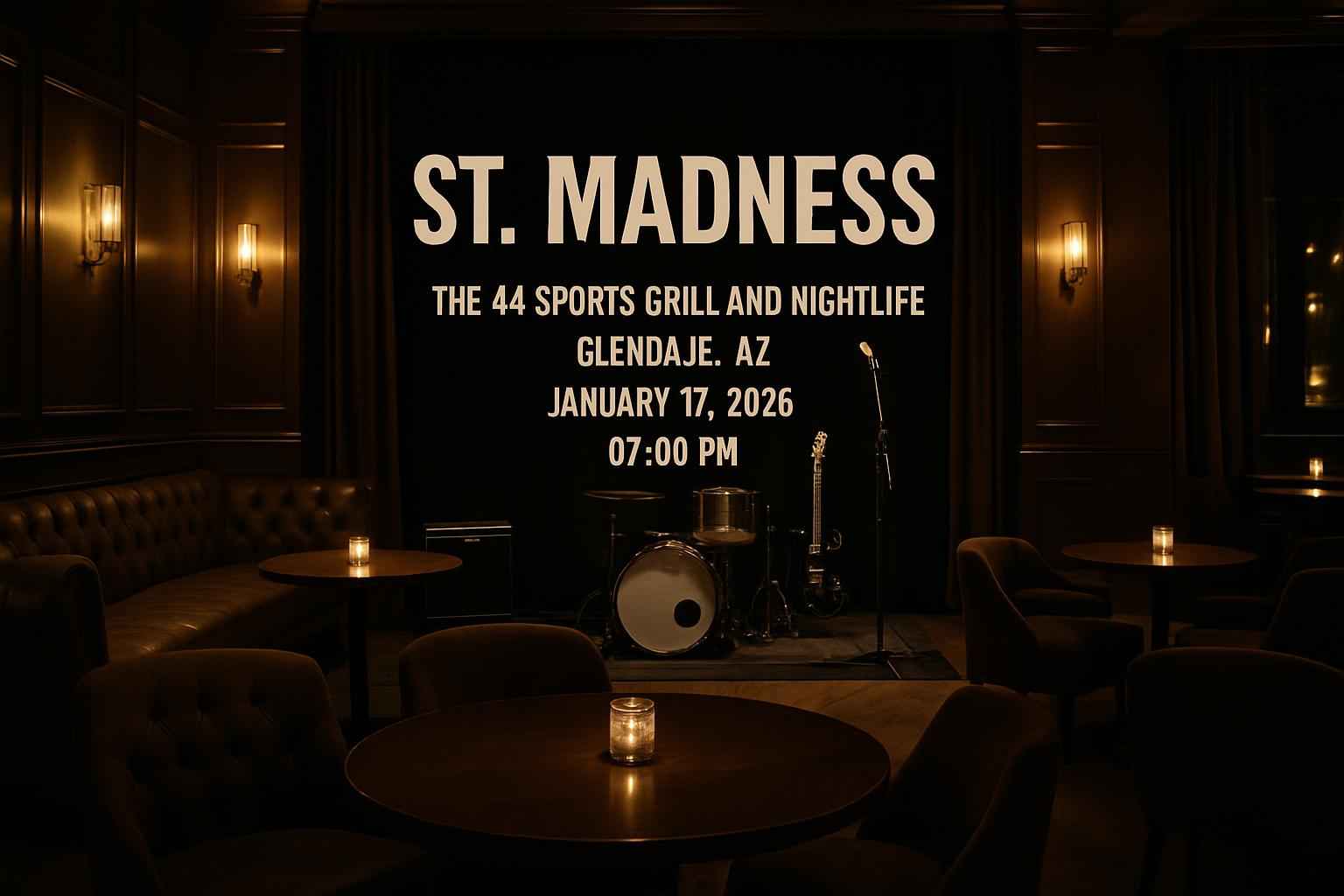 Experience an electrifying night with St. Madness at The 44 Sports Grill and Nightlife in Glendale AZ on January 17 2026 at 7 PM. This event delivers high-energy live music in one of the top nightlife venues in the West Valley blending rock anthems food specials and unbeatable drinks. Secure exclusive coupon codes from RSVP Event Agency for instant ticket savings and enjoy the best prices for group reservations and VIP seating near Phoenix and Peoria.