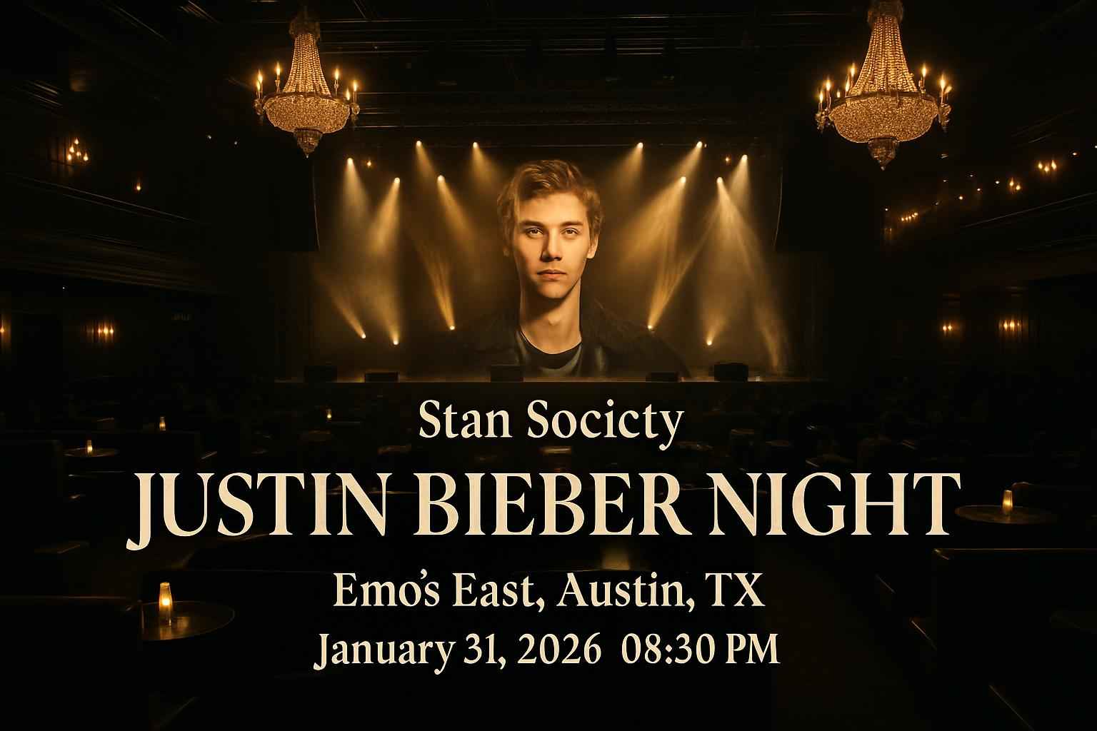 Stan Society presents Justin Bieber Night at Emos East, Austin, on January 31, 2026, starting at 8:30 PM. Fans can enjoy a high-energy tribute featuring chart-toppers and rare tracks. Secure discounted tickets using exclusive RSVP Event Agency coupon codes. Emos East offers a vibrant atmosphere, convenient parking, and an unforgettable fan experience. Book early to save and guarantee entry.