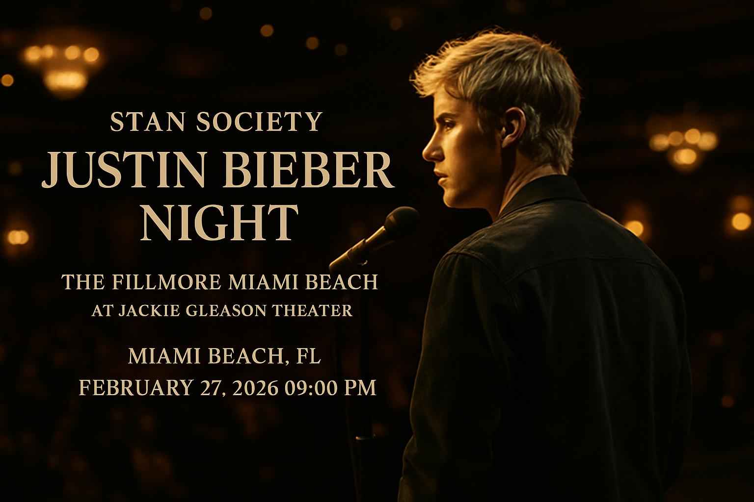Experience Stan Society Justin Bieber Night at The Fillmore Miami Beach At Jackie Gleason Theater on February 27 2026 at 9 PM. Get ready to relive the biggest Justin Bieber hits with passionate fans in one of Miami Beachs top live music venues. Secure exclusive RSVP Event Agency promo codes and enjoy unbeatable discounts on your tickets for this high-energy tribute event. Discover why this Miami Beach concert is a must-attend for Bieber fans and music lovers seeking the best deals and up-to-date event info.