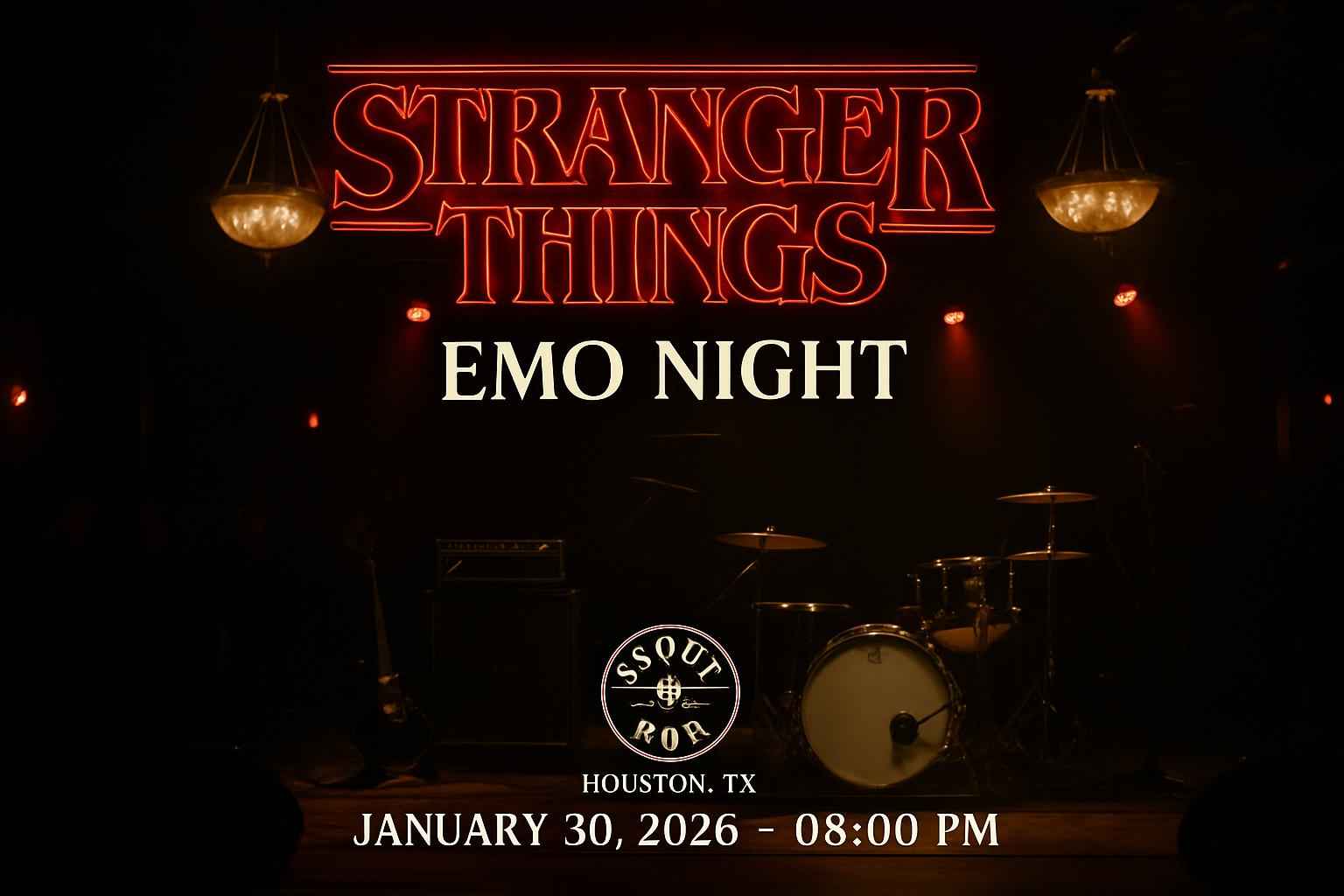 Experience Stranger Things Emo Night at Scout Bar in Houston on January 30 2026 at 8 PM for a nostalgic evening filled with your favorite hits and iconic Stranger Things vibes. This highly anticipated Houston event draws music lovers and fans of the show for a unique blend of live entertainment and immersive atmosphere. RSVP Event Agency provides exclusive promo codes to help you unlock the best ticket savings for Stranger Things Emo Night – Scout Bar – Houston TX. Secure your spot and save today with verified discounts.