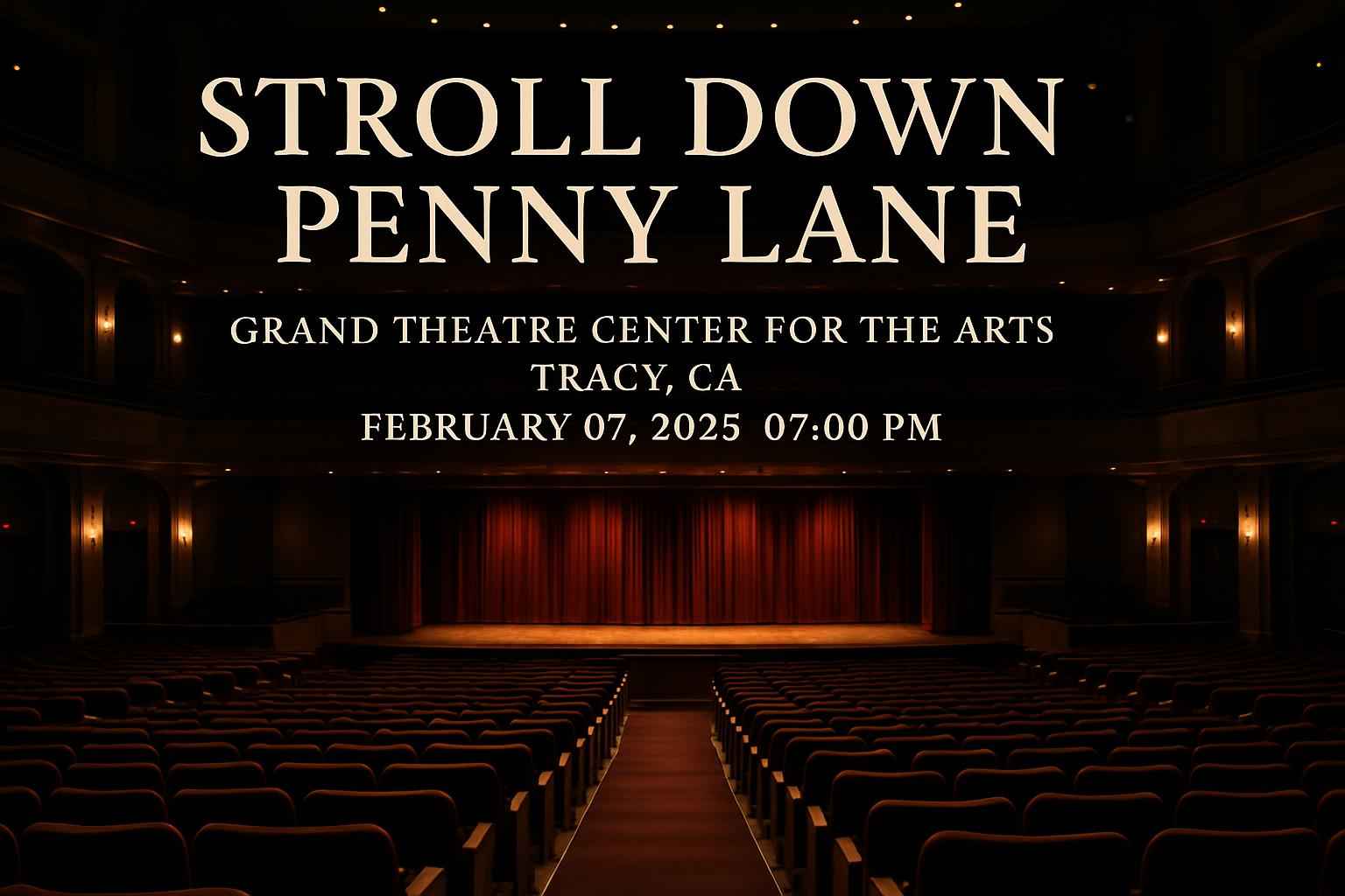 Stroll Down Penny Lane is a celebrated live music tribute highlighting classic Beatles hits and rare solo tracks. The Grand Theatre Center for The Arts offers top-tier acoustics and comfortable seating in the heart of Tracy CA. Doors open at 6 PM with the show beginning at 7 PM. Guests are encouraged to purchase tickets early for the best seat selection and local discounts. Out-of-town visitors can enjoy nearby dining and parking options for a seamless Tracy CA event experience.