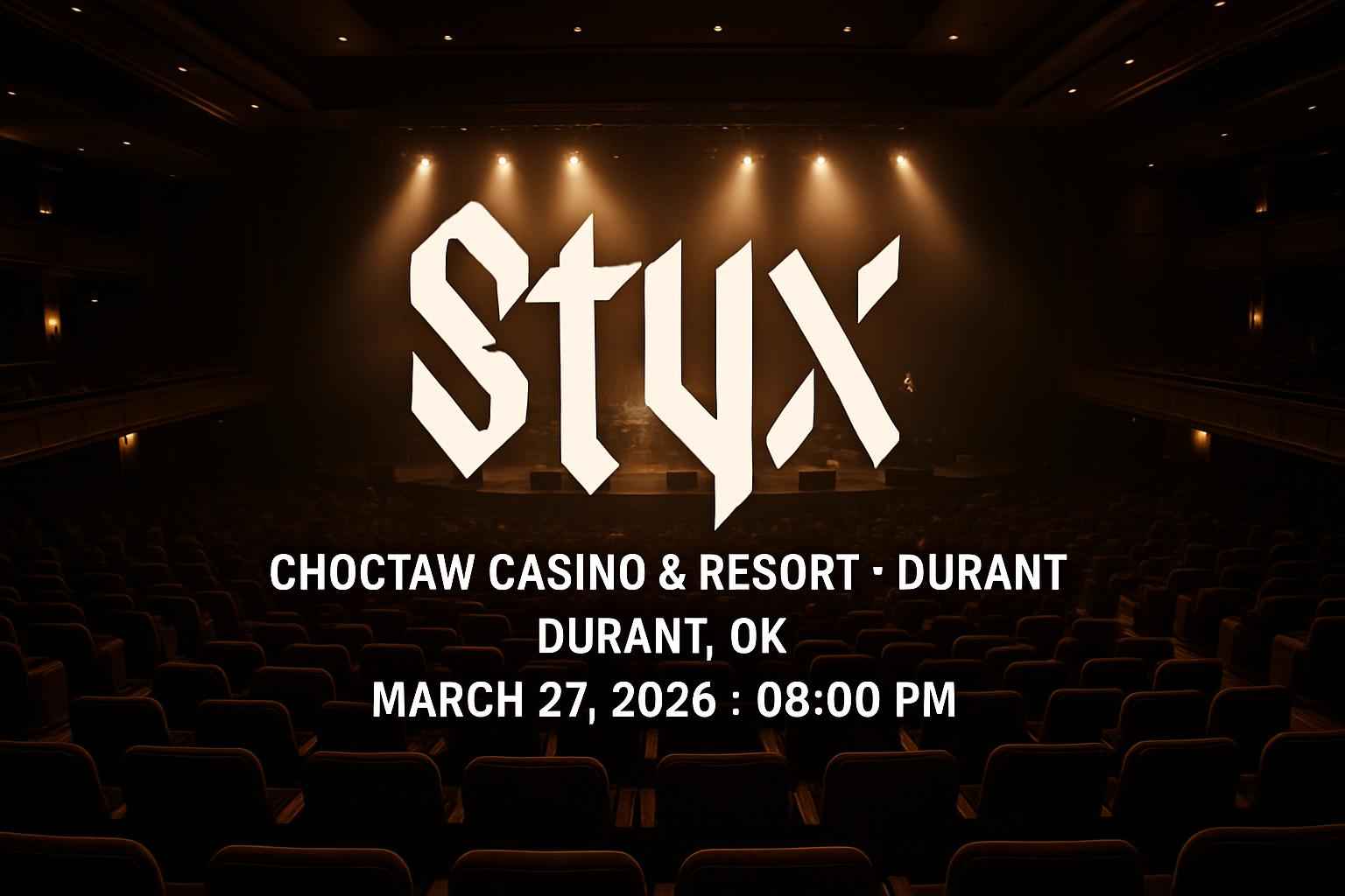 Experience a legendary night with Styx at Choctaw Casino and Resort in Durant OK on March 27 2026 at 8 PM. Enjoy an iconic rock performance at one of the top live music venues in Oklahoma known for outstanding acoustics and an immersive concert environment. Secure exclusive Styx concert promo codes through RSVP Event Agency to unlock the best discounts for your tickets today.