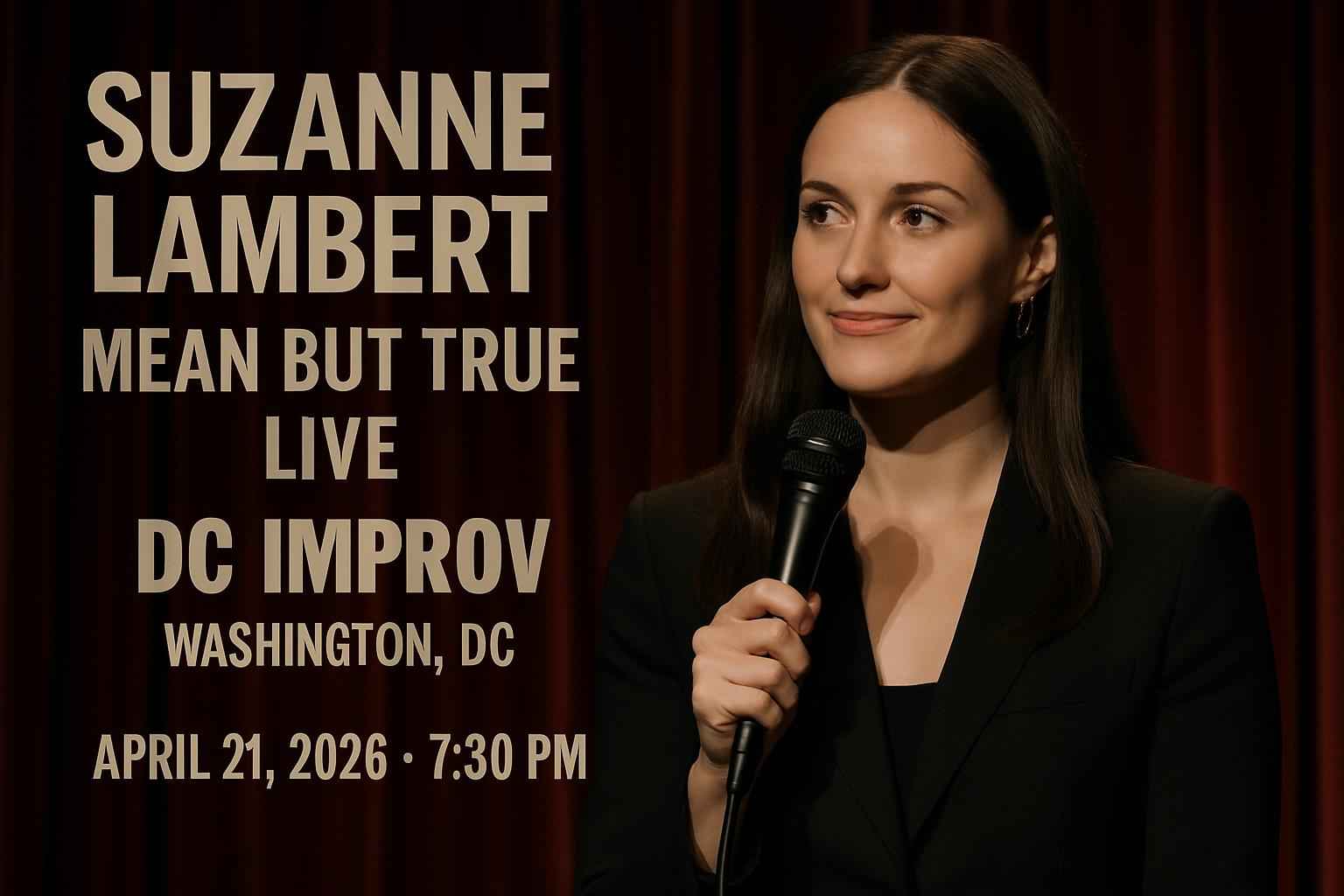Suzanne Lambert Mean But True Live takes place at DC Improv on April 21 2026 at 0730 PM. This acclaimed comedy event features Suzanne Lambert delivering sharp insightful humor in a renowned local venue. The DC Improv offers a vibrant atmosphere and convenient downtown location making it a top choice for comedy fans searching for unforgettable live entertainment in Washington DC.