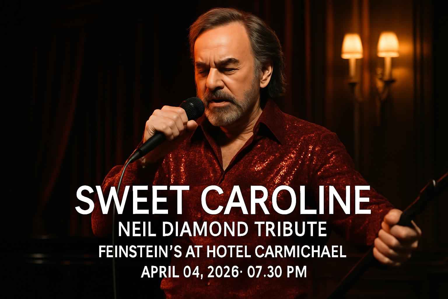 Experience Sweet Caroline – Neil Diamond Tribute at Feinsteins At Hotel Carmichael in Carmel IN on April 4 2026 at 730 PM. This highly anticipated Neil Diamond tribute concert brings classic hits to life with unmatched energy and authenticity. Secure the best seats and enjoy exclusive savings with verified coupon codes from RSVP Event Agency. Perfect for fans searching for Sweet Caroline tickets promo codes and live music in Carmel IN.