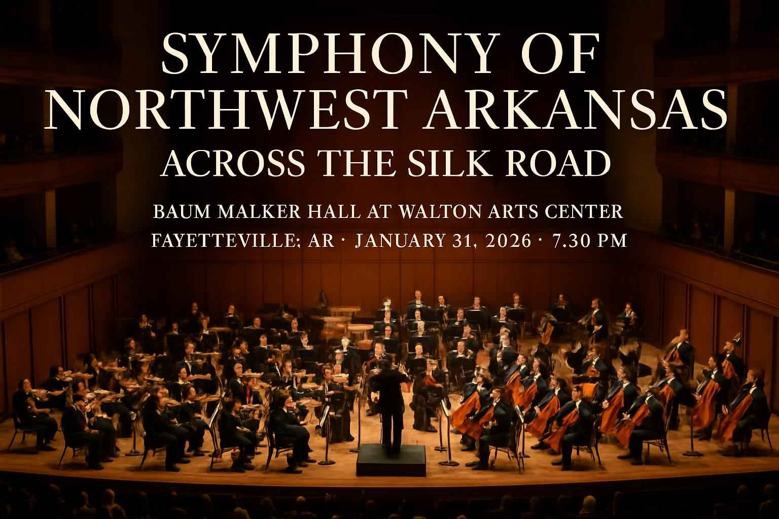 Experience a unique blend of global music influences at the Symphony of Northwest Arkansas Across the Silk Road event at Baum Walker Hall At Walton Arts Center in Fayetteville AR on January 31 2026 at 0730 PM. This highly anticipated concert showcases rich Silk Road-inspired compositions performed by leading symphonic musicians. Secure the best Symphony of Northwest Arkansas Across the Silk Road coupon codes through RSVP Event Agency for exclusive savings and premium seating options.