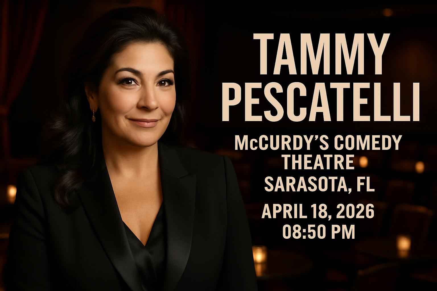 Tammy Pescatelli brings her acclaimed stand-up act to McCurdys Comedy Theatre located in downtown Sarasota FL. This one-night event starts at 0850 PM on April 18 2026. Audiences can expect sharp humor and relatable stories from one of Americas favorite comedians. McCurdys is known for its intimate atmosphere and high-quality comedy shows making it a top choice for locals and visitors searching for live entertainment near downtown Sarasota.