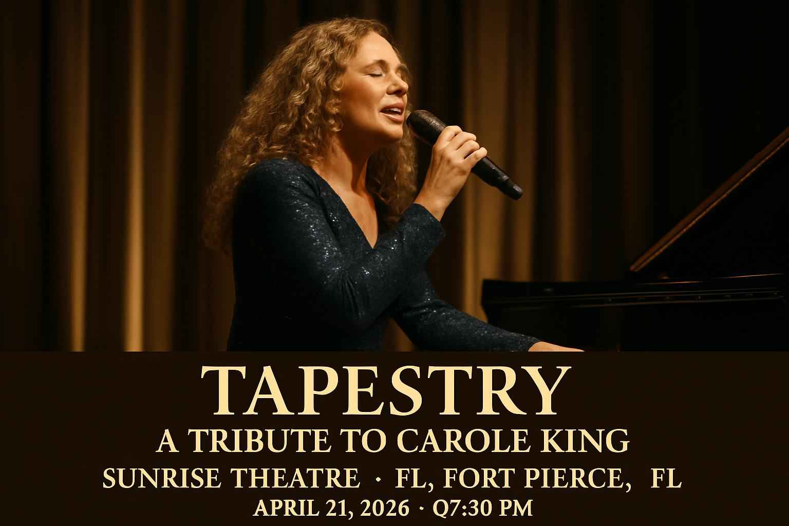 Experience the unforgettable Tapestry – A Tribute To Carole King at Sunrise Theatre in Fort Pierce FL on April 21 2026 at 0730 PM. This live tribute brings Carole Kings timeless hits to the stage delivering a highly acclaimed performance in the heart of downtown Fort Pierce. Tap into exclusive savings and local event details through RSVP Event Agency your trusted source for verified promo codes and up-to-date show information.