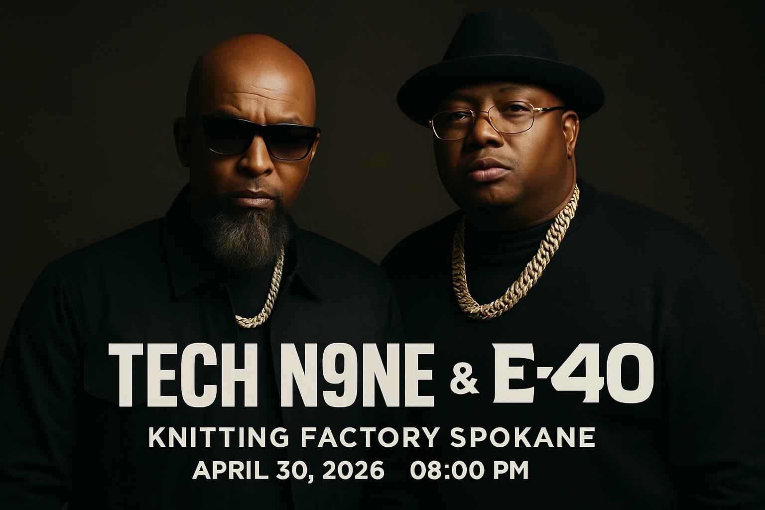 Tech N9ne and E-40 bring their chart-topping hits and dynamic stage presence to Knitting Factory Spokane, located in downtown Spokane, WA. Doors open at 7:00 PM with the show starting at 8:00 PM on April 30 2026. Tickets are available in multiple price ranges for general admission and VIP upgrades. Early ticket buyers often secure the best seats and deeper discounts. RSVPs are recommended as this show is expected to sell out quickly.