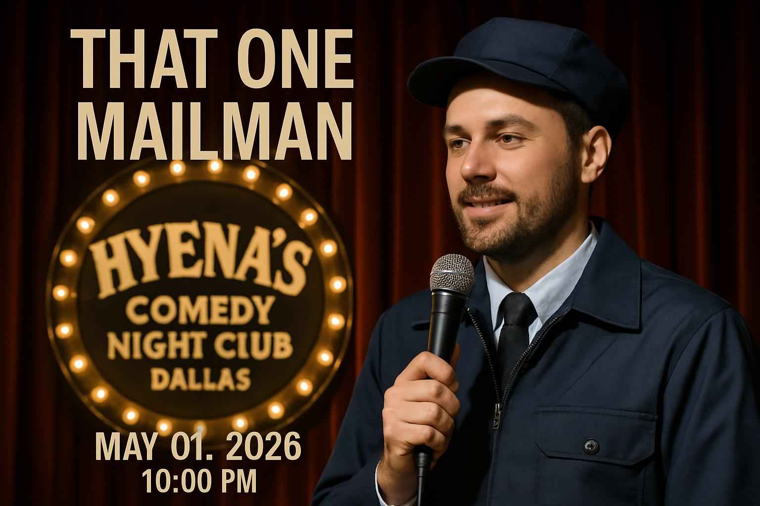 Discover the excitement of That One Mailman at Hyenas Comedy Night Club in Dallas TX on May 01 2026 at 8 PM. Local comedy fans and Dallas event seekers are searching for the best That One Mailman Hyenas Comedy Night Club Dallas coupon codes and discount tickets to maximize savings and secure a fun night out. RSVP Event Agency delivers verified promo codes for That One Mailman ensuring you get unbeatable deals with fast digital delivery and guaranteed admission.