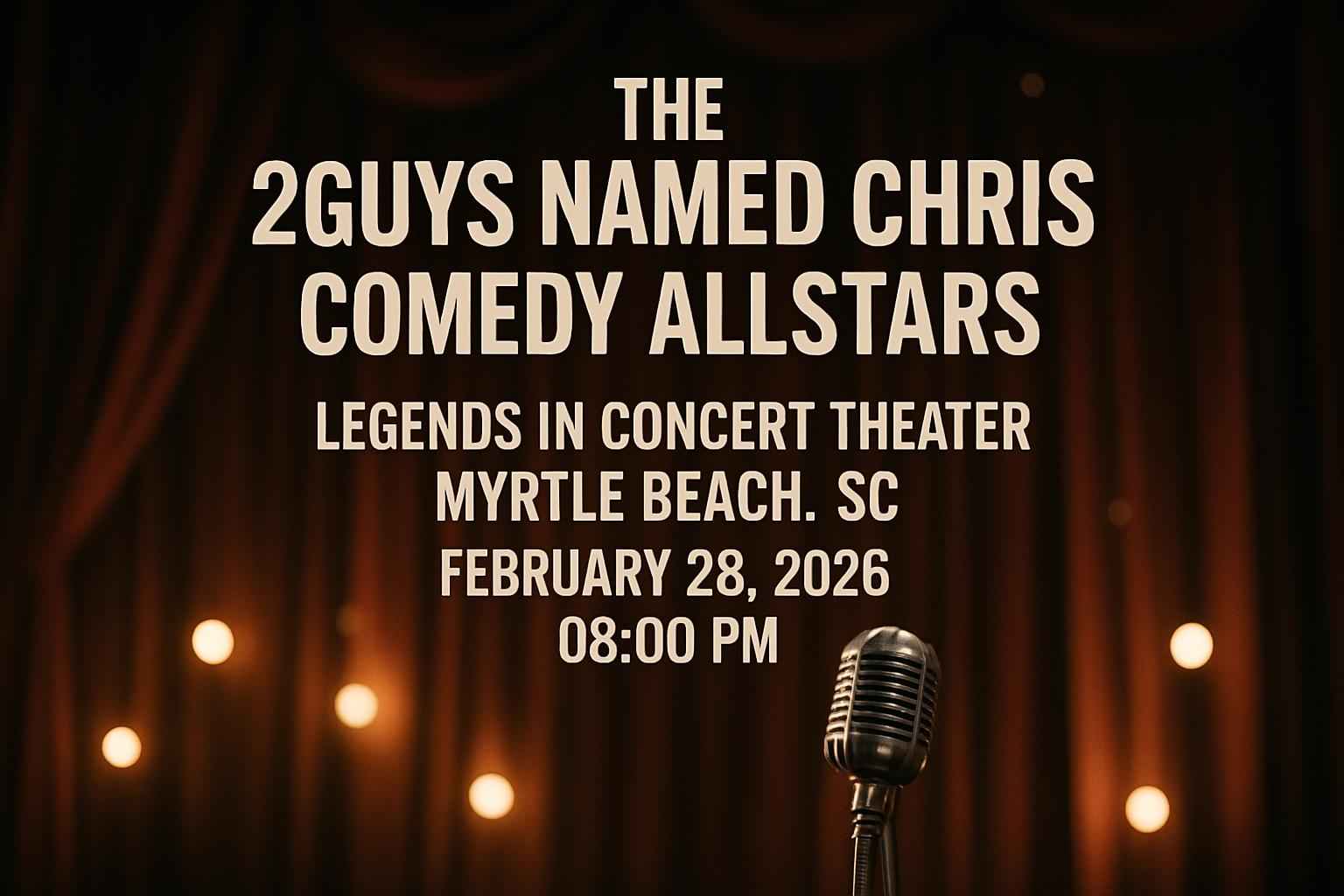 Experience top stand-up comedy at The 2Guys Named Chris Comedy Allstars on February 28, 2026, 8 PM, at Legends in Concert Theater, Myrtle Beach. Secure discounted tickets and VIP seating using RSVP Event Agency promo codes. Enjoy a vibrant atmosphere, top comedians, and easy access to dining and parking for an unforgettable night of laughter.