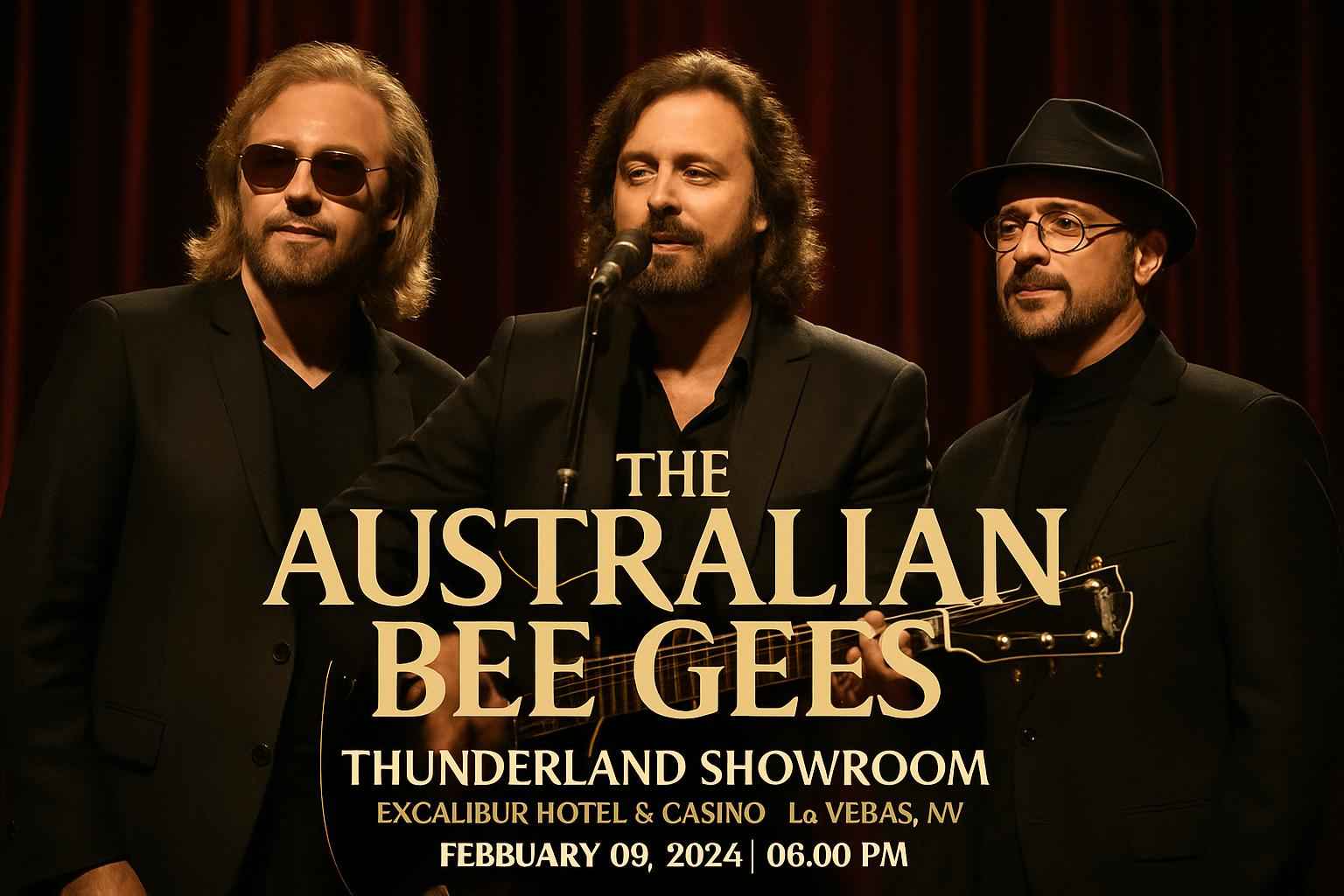 Experience The Australian Bee Gees at the Thunderland Showroom in Excalibur Hotel and Casino Las Vegas NV on February 09 2026 at 6 PM. This renowned tribute band brings the legendary Bee Gees hits to life in an immersive concert setting. Located on the Las Vegas Strip this event is perfect for music fans seeking an authentic Bee Gees experience with state-of-the-art sound and lighting. Secure exclusive RSVP Event Agency promo codes for instant ticket savings today.