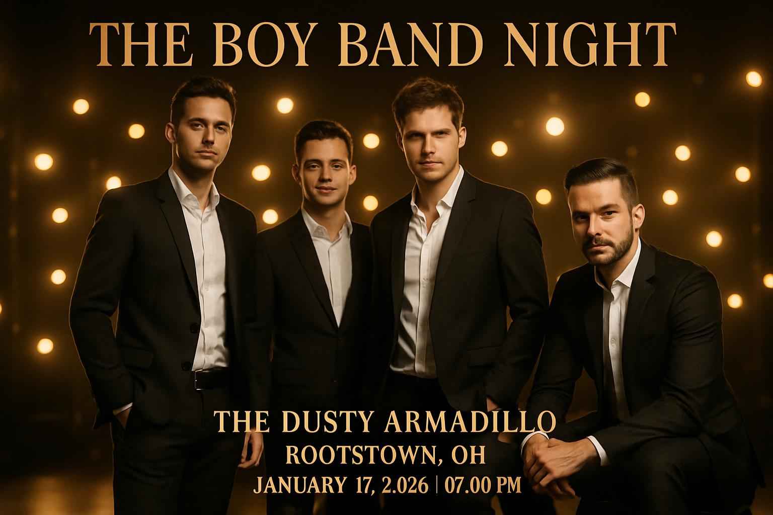 The Boy Band Night begins at 7 PM on January 17 2026 at The Dusty Armadillo Rootstown OH. Arrive early for parking and the best seating options.