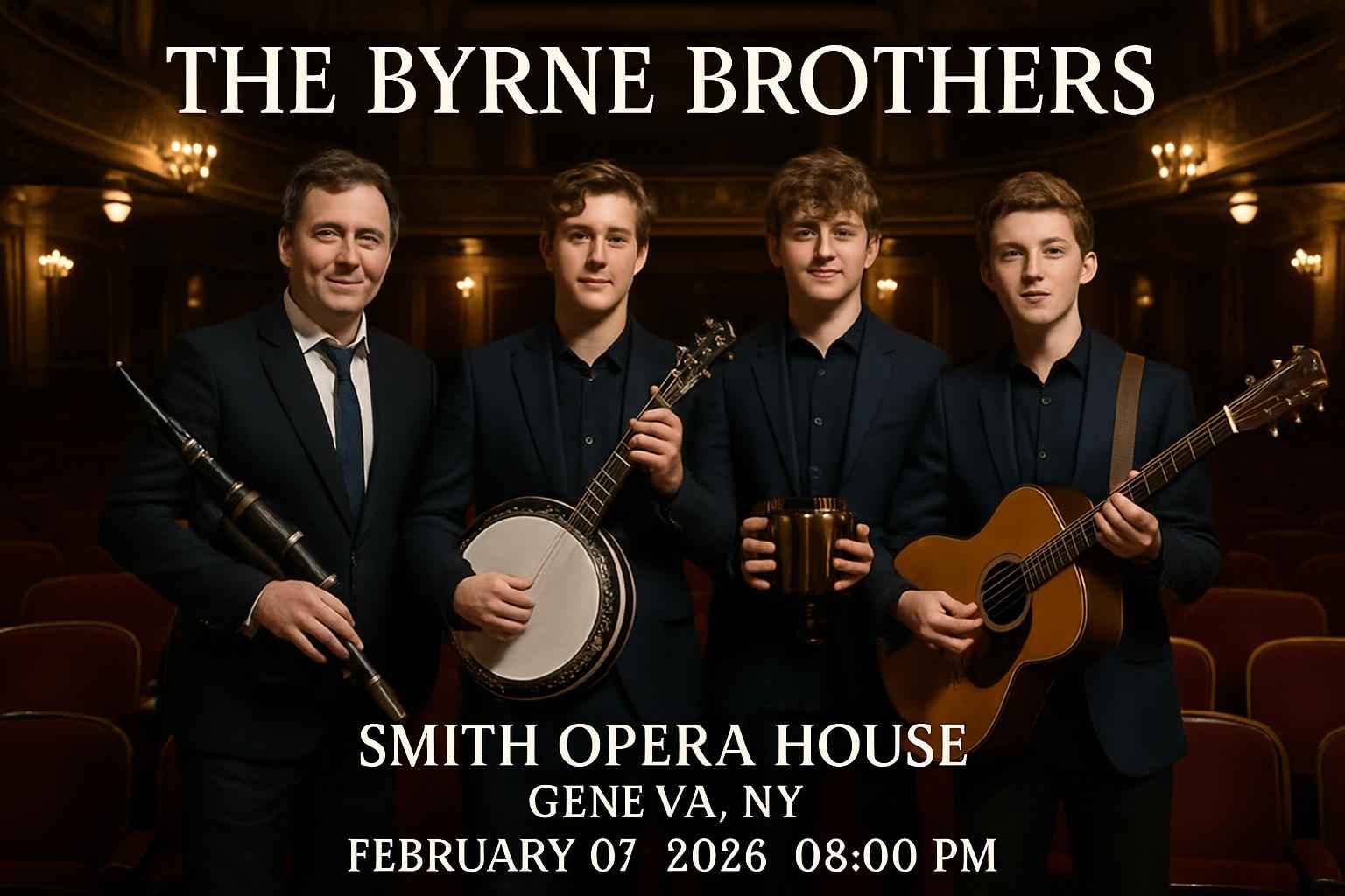 The Byrne Brothers perform Irish folk music live at Smith Opera House, Geneva NY, on February 7, 2026, at 8 PM. RSVP Event Agency offers verified promo codes for discounted tickets and best seat selection. The historic venue provides accessible seating and convenient parking. Arrive early for smooth entry and enjoy a vibrant Celtic music experience in the Finger Lakes region.