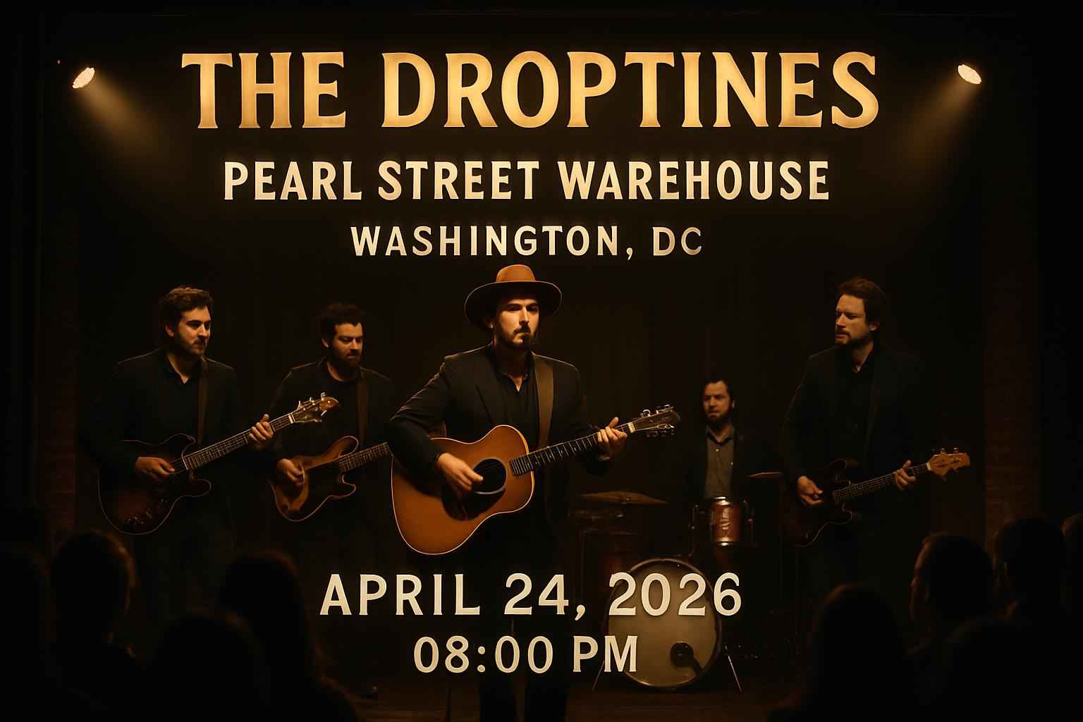 The Droptines bring their signature Texas-inspired sound to Pearl Street Warehouse located at 33 Pearl St SW Washington DC 20024. Doors open at 7 PM with the show starting at 8 PM. Enjoy a dynamic live set from one of the fastest-rising names in Americana and country rock. This event is open to ages 21 and up. On-site parking and metro access are available for convenience.
