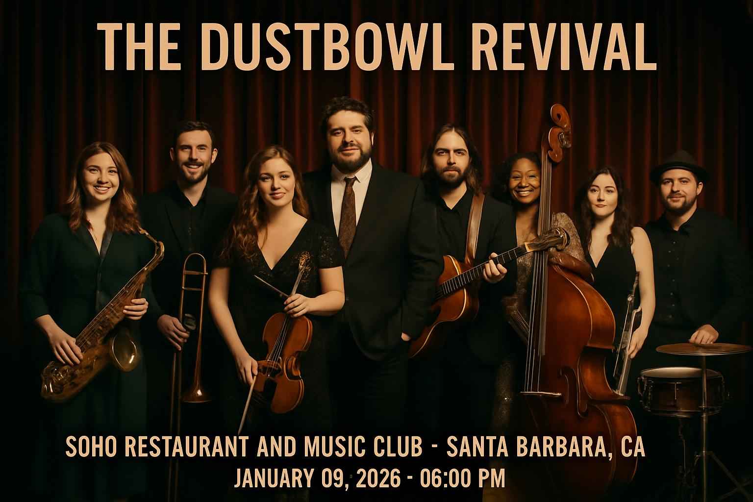 Experience the energy of The Dustbowl Revival live at Soho Restaurant And Music Club in Santa Barbara CA on January 09 2026 at 8 PM. Secure exclusive promo codes and event details through RSVP Event Agency for this top-rated Americana music event. Enjoy local hospitality and the best ticket prices with proven discount codes for this unforgettable night of live music.