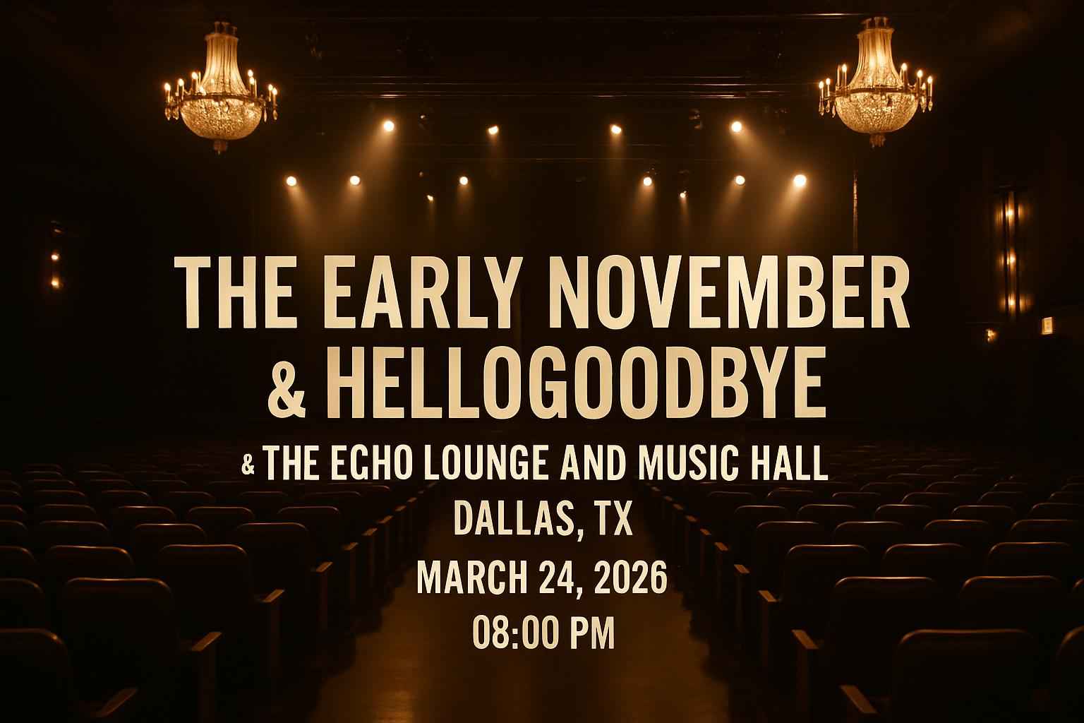 Experience an unforgettable night in Dallas with The Early November and Hellogoodbye at The Echo Lounge and Music Hall on March 24 2026 at 8 PM. Secure your seats at one of the top Dallas live music venues and discover exclusive RSVP Event Agency coupon codes for instant ticket savings. The Early November and Hellogoodbye fans can unlock verified promo codes and enjoy the best ticket deals for this highly anticipated 2026 Dallas concert event.