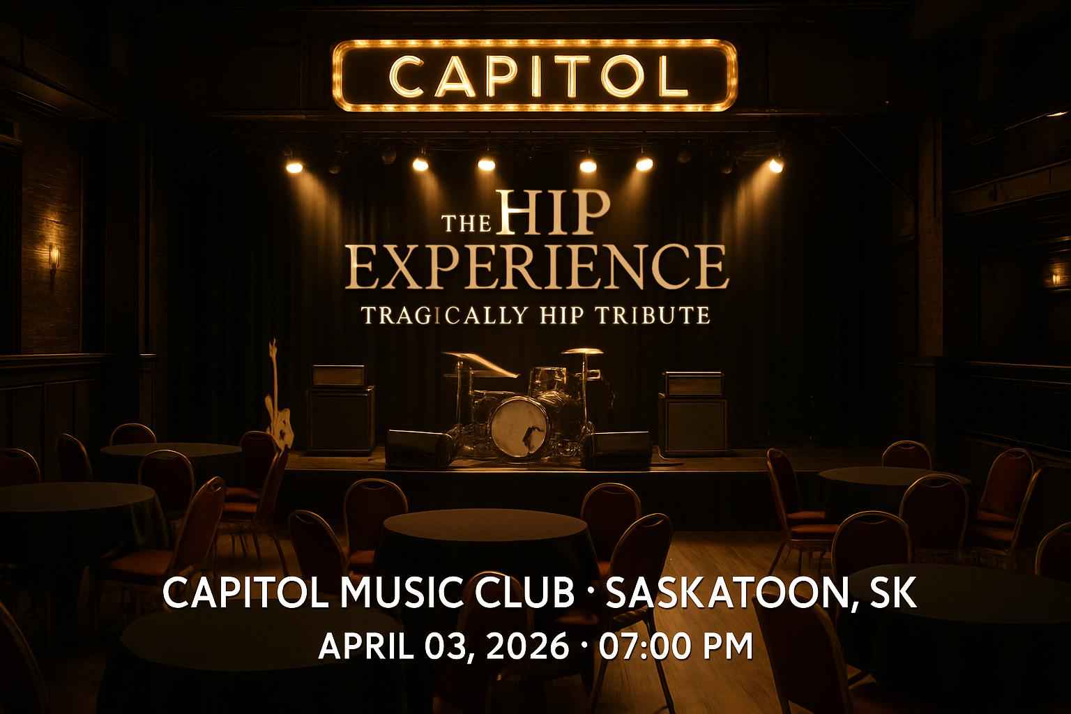 Experience the iconic sounds of The Tragically Hip at The Hip Experience live tribute at Capitol Music Club Saskatoon on April 3 2026 at 7:00 PM. This concert event brings the legendary spirit of The Tragically Hip to Saskatoon SK for one unforgettable night. Secure exclusive promo codes from RSVP Event Agency for top discounts on tickets and enhance your night with extra savings. Join local fans for the ultimate rock tribute just steps from downtown Saskatoon.