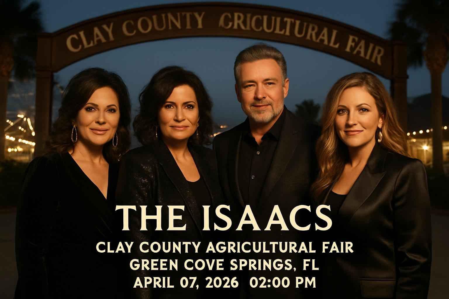 The Isaacs headline the annual Clay County Agricultural Fair in Green Cove Springs FL on April 07 2026. Doors open at 1 PM with the concert beginning at 2 PM. The event takes place at Clay County Fairgrounds a popular destination for live music and regional festivals. Enjoy local food vendors carnival rides and a family-friendly atmosphere. Bring your group for a day of music and community in Northeast Florida.