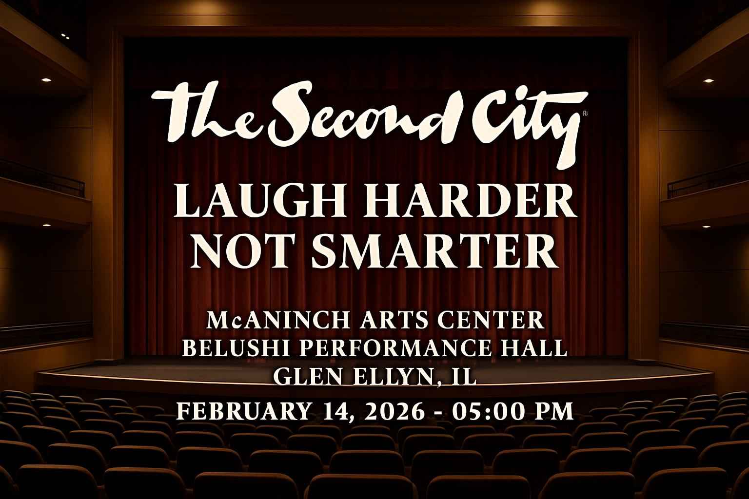 Experience the sharpest comedy in Chicagoland at The Second City Laugh Harder Not Smarter live at McAninch Arts Center in Belushi Performance Hall Glen Ellyn IL on February 14 2026 at 5 PM. Secure your seats for an evening of unscripted laughter and bold improv with legendary performers from the world-famous Second City. This exclusive Glen Ellyn comedy event blends timely satire and crowd interaction making it a top choice for live entertainment near Chicago.