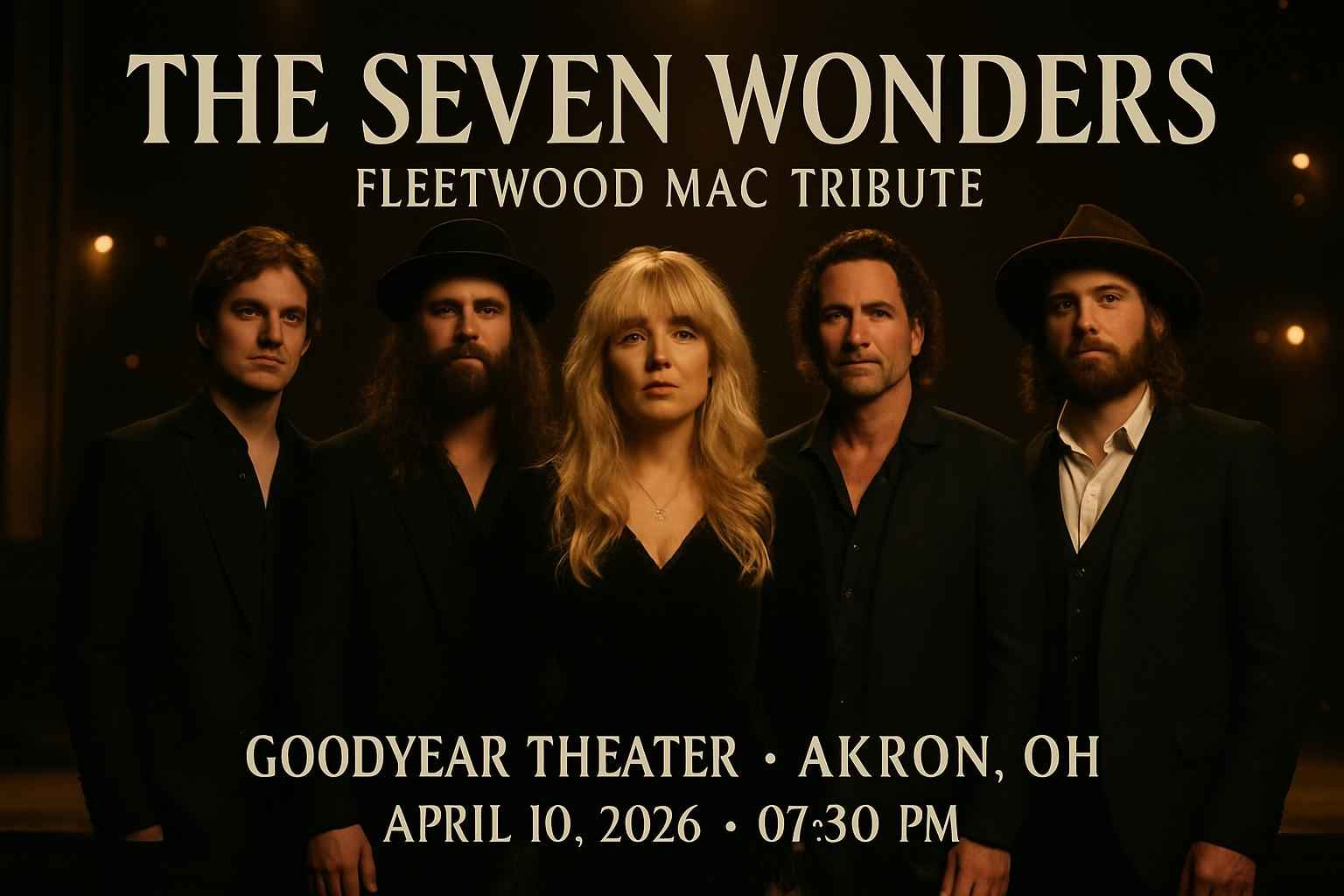 The Seven Wonders tribute band recreates the iconic Fleetwood Mac experience, featuring top musicians and authentic performances of classic hits. Held at the historic Goodyear Theater in Akron, this April 10, 2026 concert welcomes fans seeking Fleetwood Mac tribute concerts near me, Akron live music events, and secure ticket deals. Doors open at 0630 PM, allowing guests to enjoy the venue and local amenities before the show. Reserve your tickets securely and access exclusive coupon codes for added value.