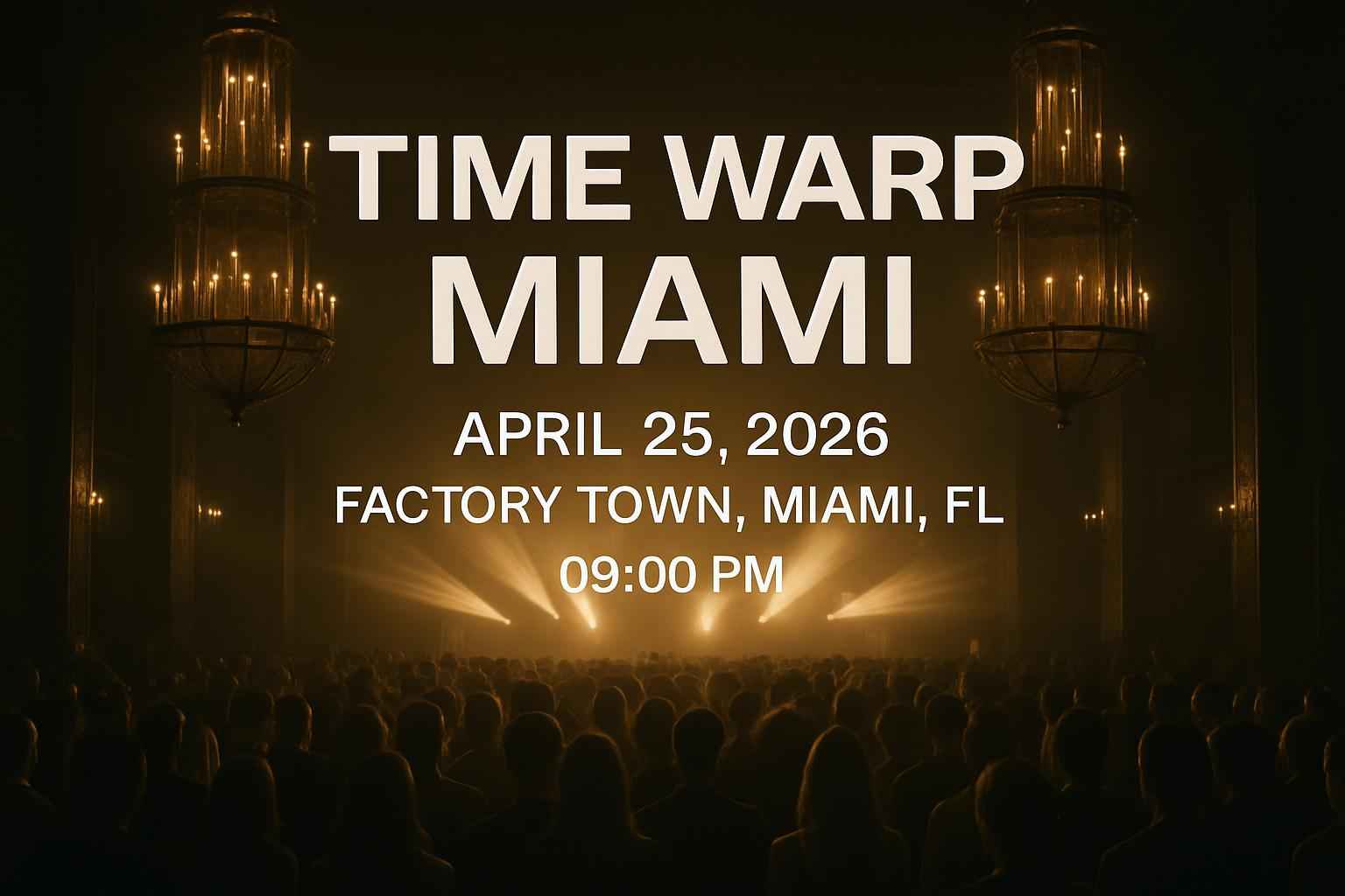 Time Warp Miami at Factory Town takes place on April 25 2026 starting at 9:00 PM.